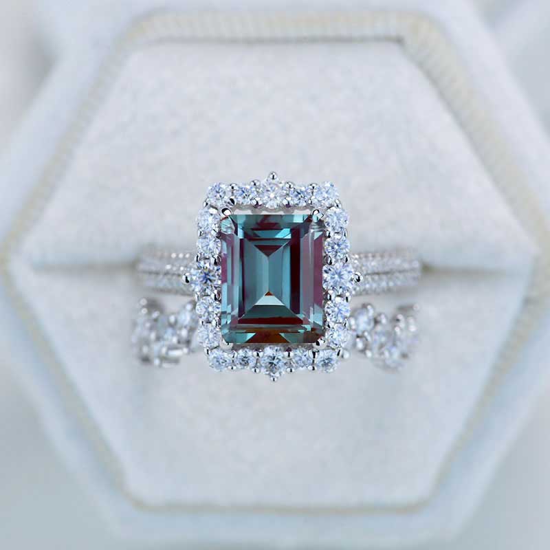 3 Carat Emerald Cut Ethically Lab-Grown Alexandrite Center Stone Engagement ring set of two rings.