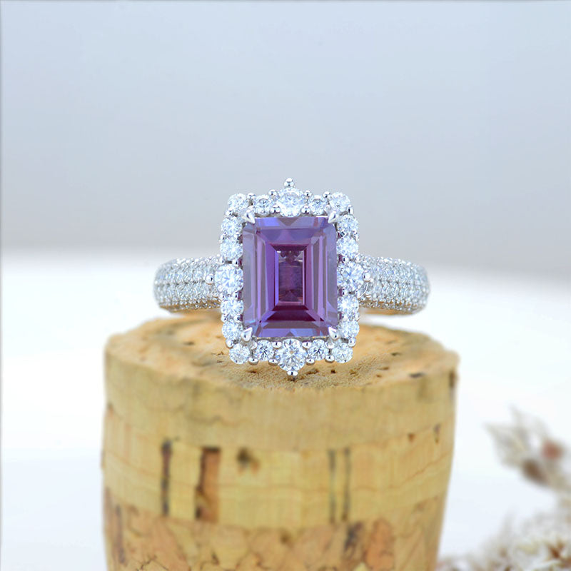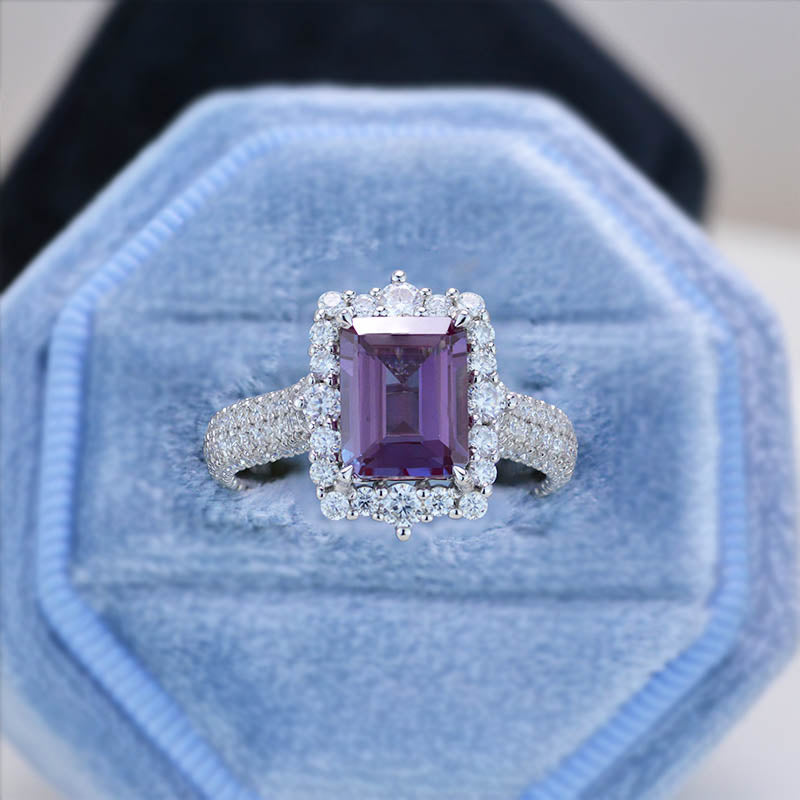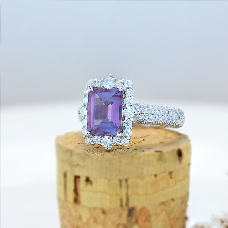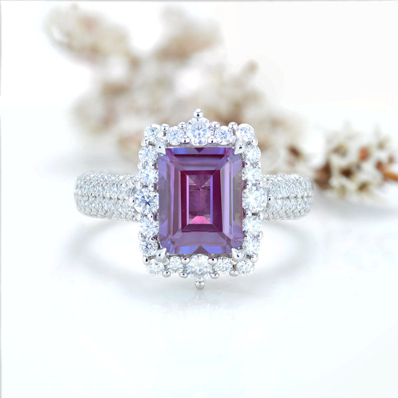 3 Carat Ethically Lab-Grown Alexandrite Emerald Shaped Step Cut Center Stone Engagement ring. Setting: Platinum PT900
