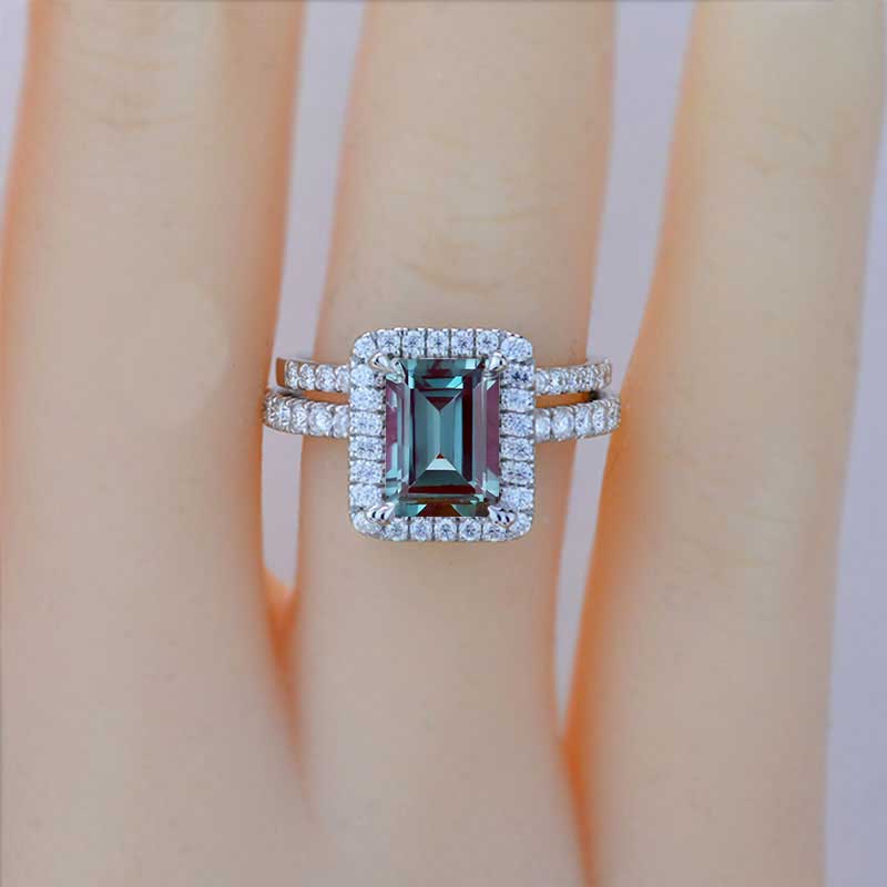 Setting: 14K White Gold (Available in Yellow Gold and Rose Gold) Center Stone: 3 Carat Approximately - 9x7 mm Radiant Cut Ethically Lab-Grown Alexandrite Side Stones: Moissanite Color: D - Colorless Clarity: VS2-Si1 Cut: Excellent The total approximate weight of side stones: 0.9ct - 198 pieces.