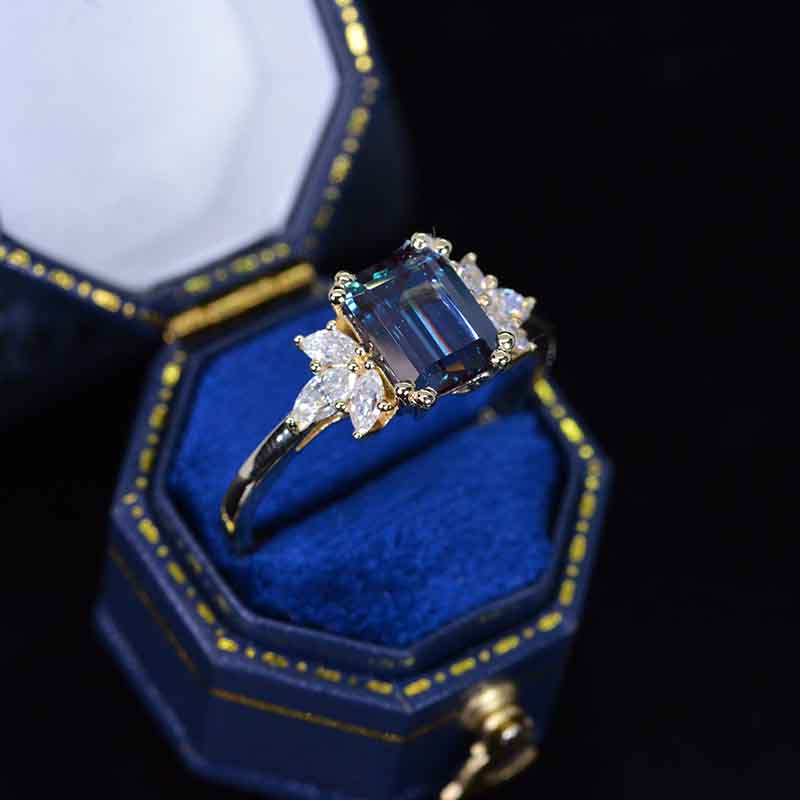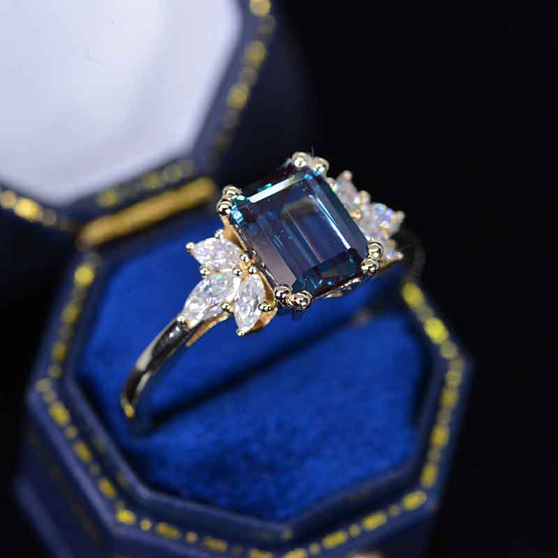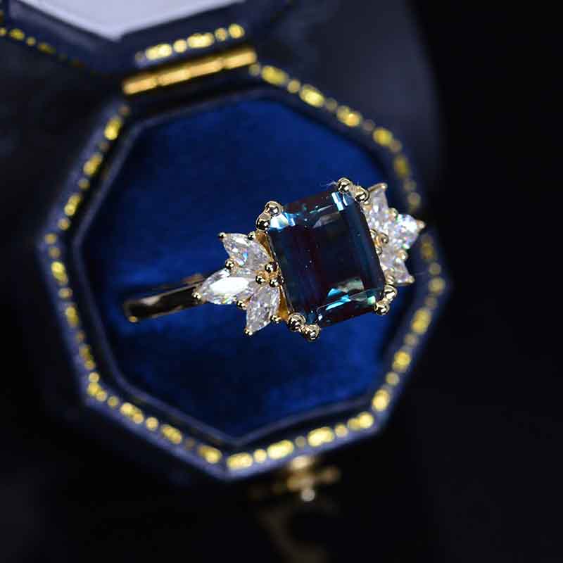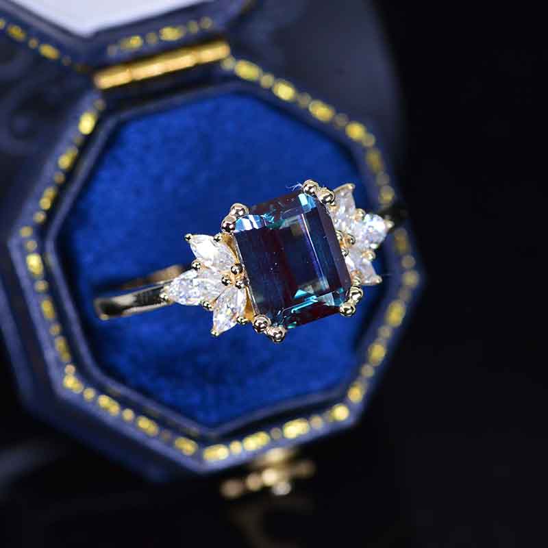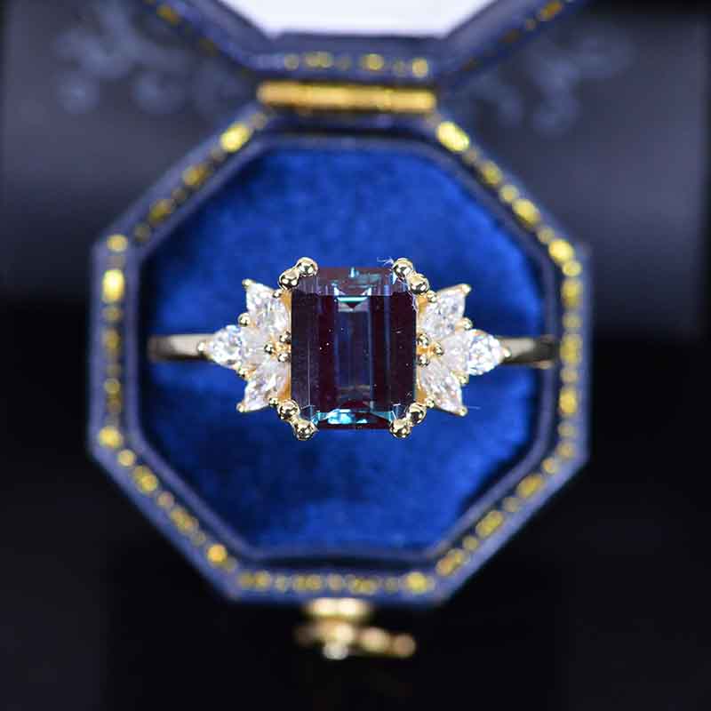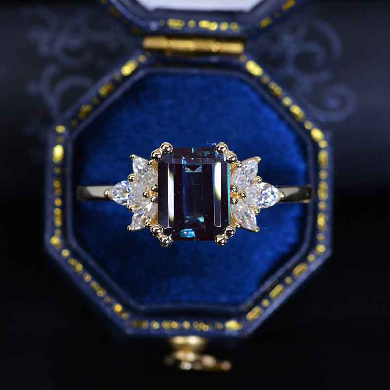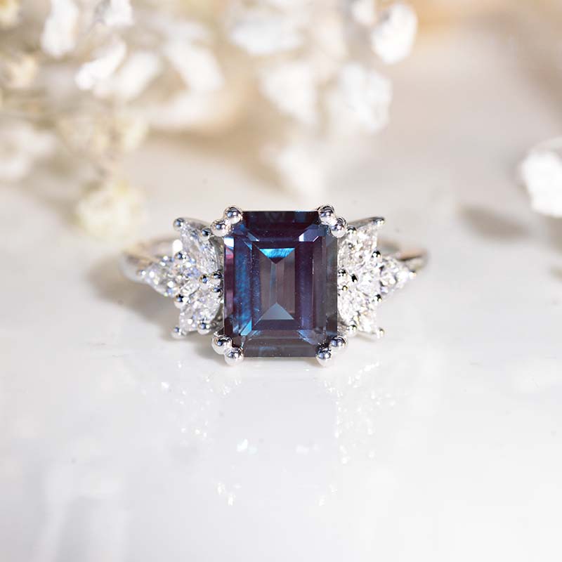 The default design option features 9x7mm Step Cut Ethically Lab-Grown Alexandrite Stone