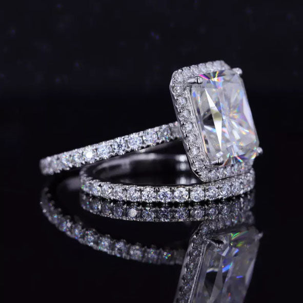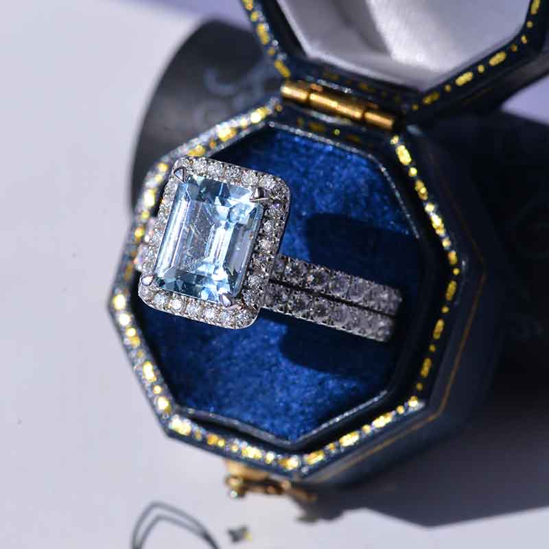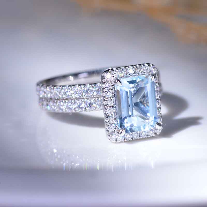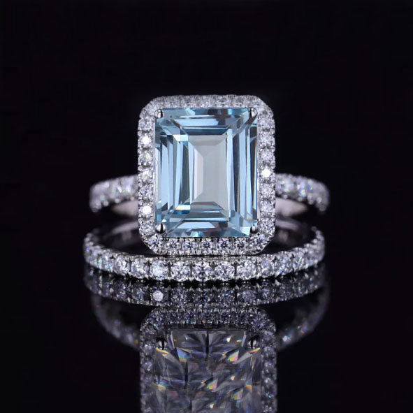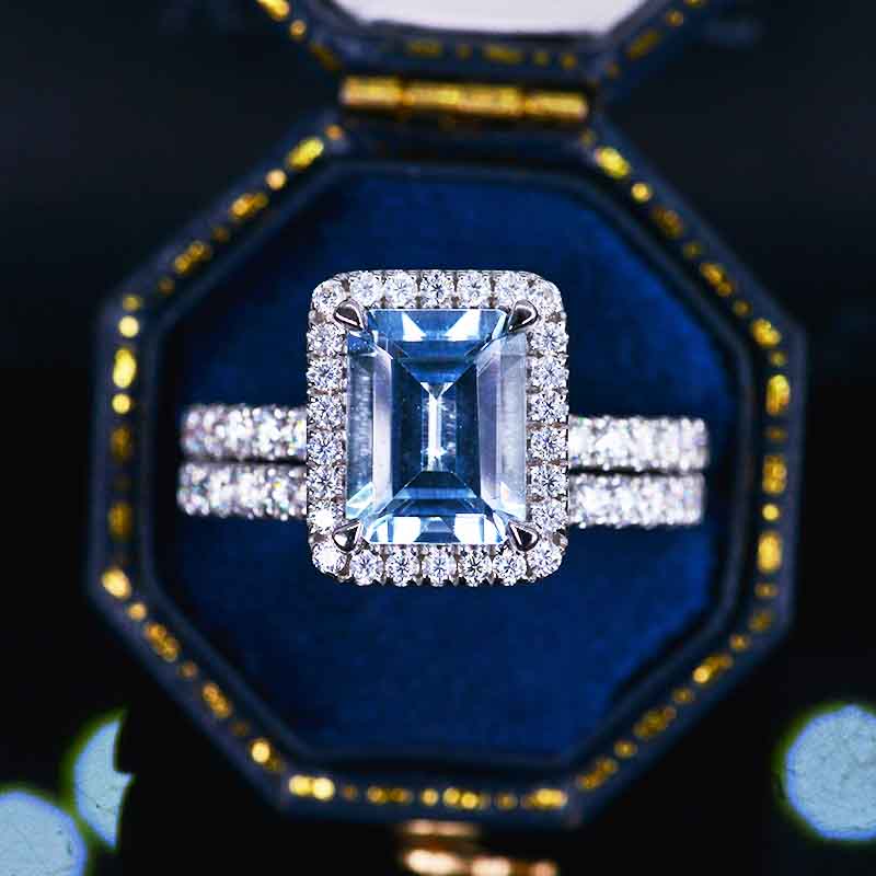 Center Stone: 3 Carat Approximately - 9x7mm Emerald Cut Genuine Aquamarine Clarity:VVS1 Side Stones: Moissanite Color: D - Colorless Clarity: VS2-Si1 Cut: Excellent The total approximate weight of side stones: 0.9ct - 198 pieces.