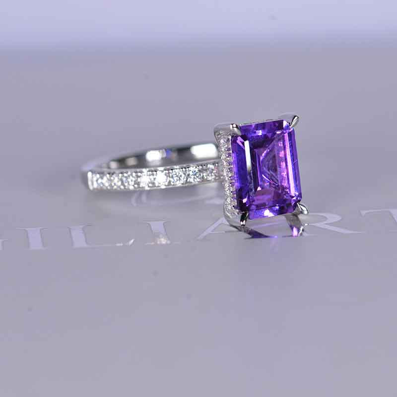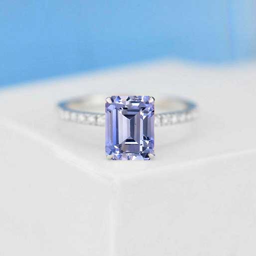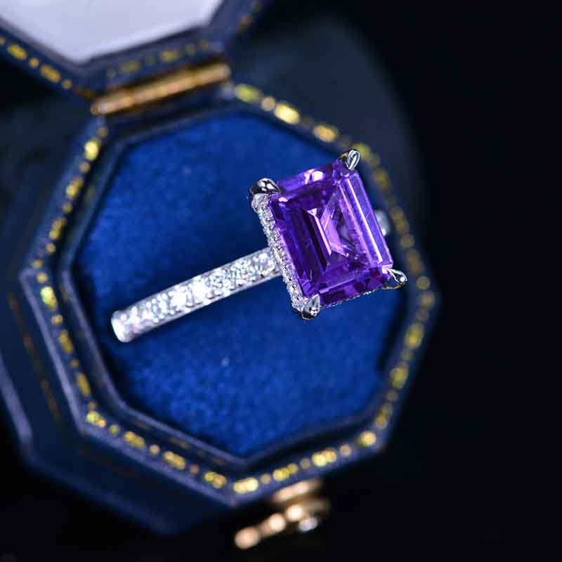 The default design option features 9x7mm Emerald Cut Ethically Lab-Grown Purple Sapphire stone