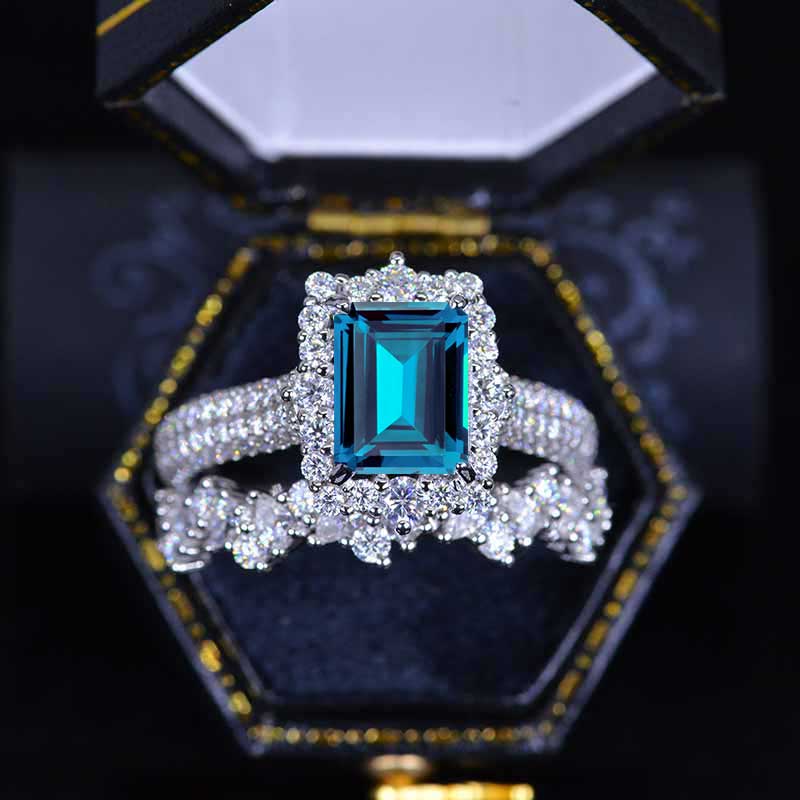 3 Carat Emerald Cut Ethically Lab-Grown Cornflower Sapphire Center Stone Engagement ring set.