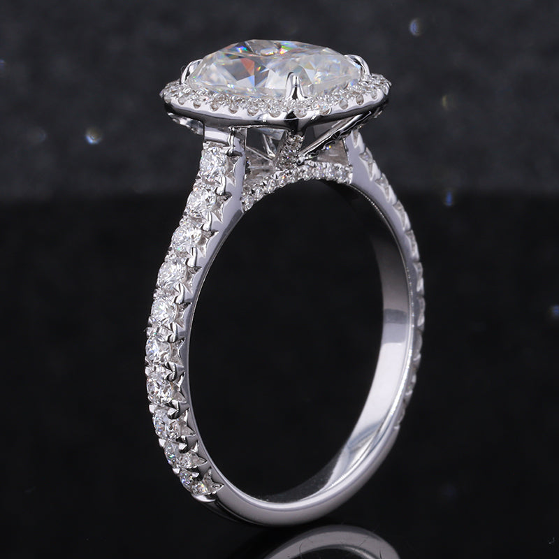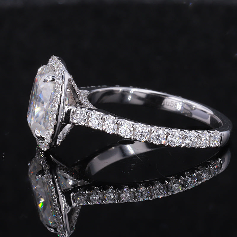 The default design option features 9x7mm Cushion Moissanite Center And Accent Stones, D-Colorless, VVS1-Clarity, VG-Cut, Ex-Polish, VG-Symmetry