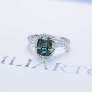 3Ct Cushion Teal Sapphire 14K White Engagement Ring, Cushion Halo Engagement Ring