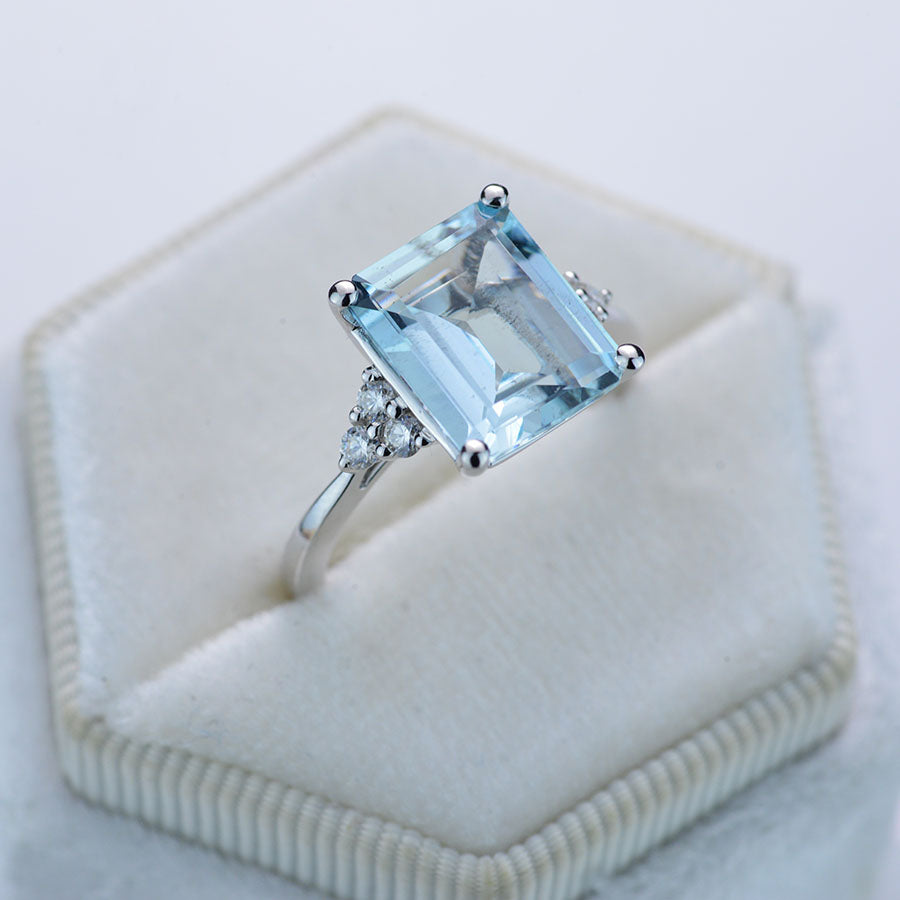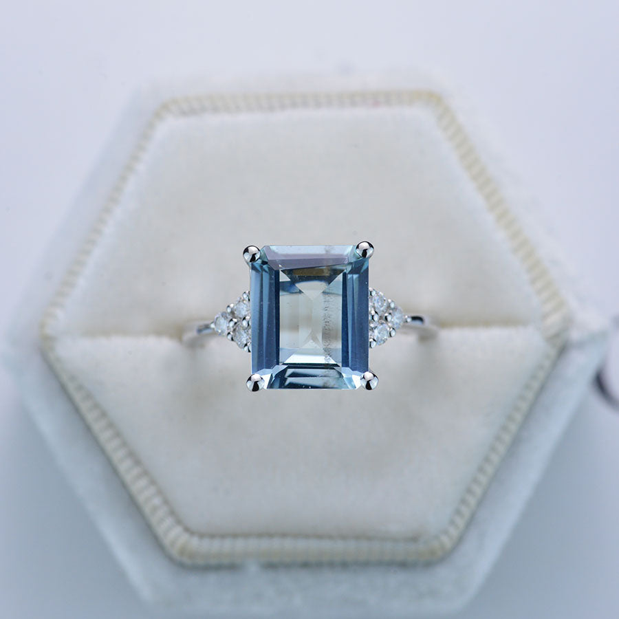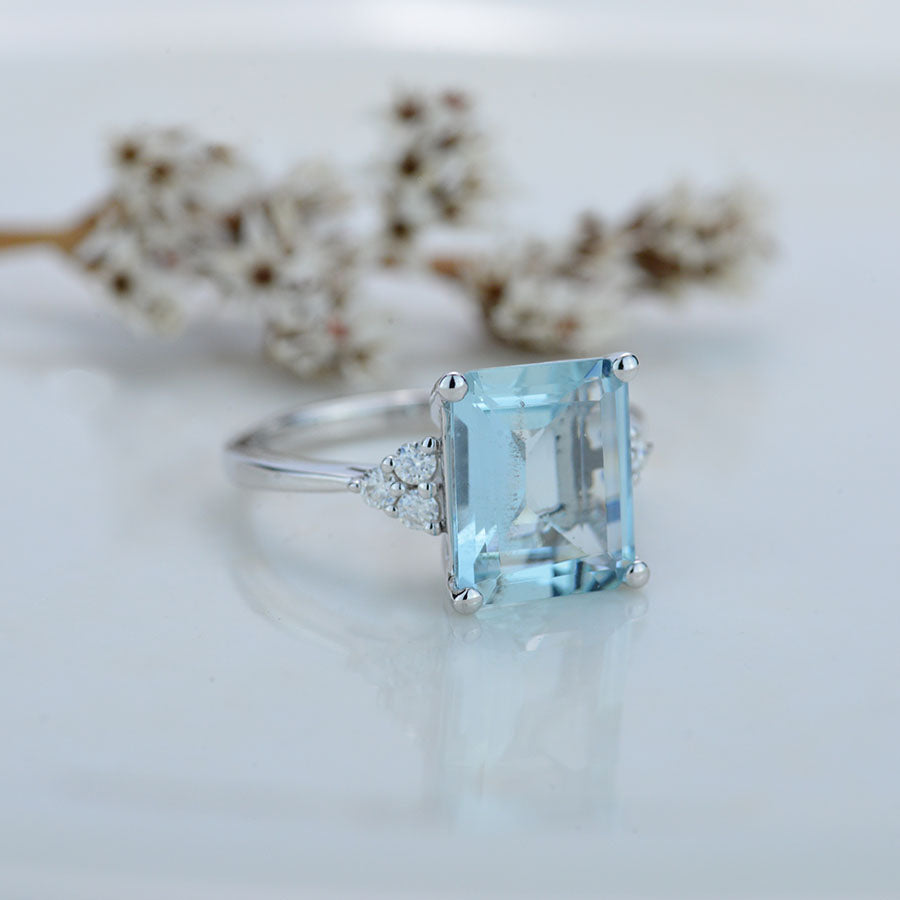 The default design option features 9x7mm Emerald Shaped Step Cut Natural Aquamarine AAA+ Quality, Set with Moissanite Accents stonesD-Colorless, VVS1-Clarity,