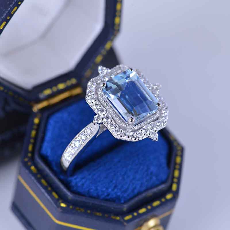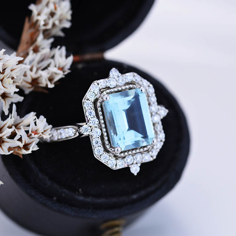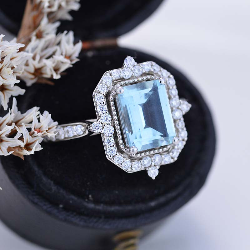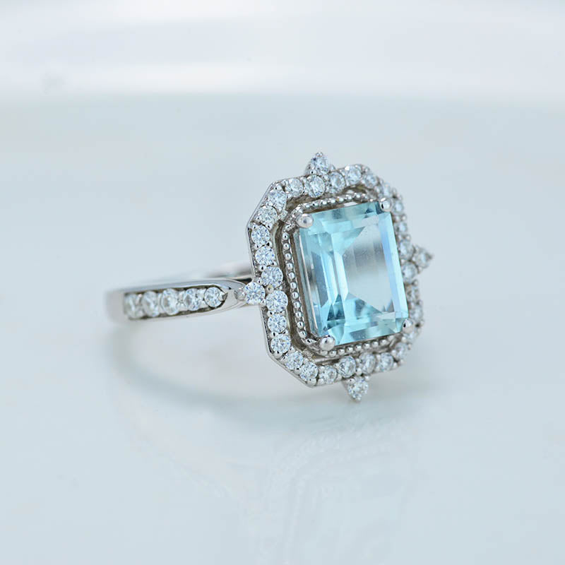 3Ct Emerald cut Halo Aquamarine ring, Aquamarine solitaire ring, natur - Giliarto