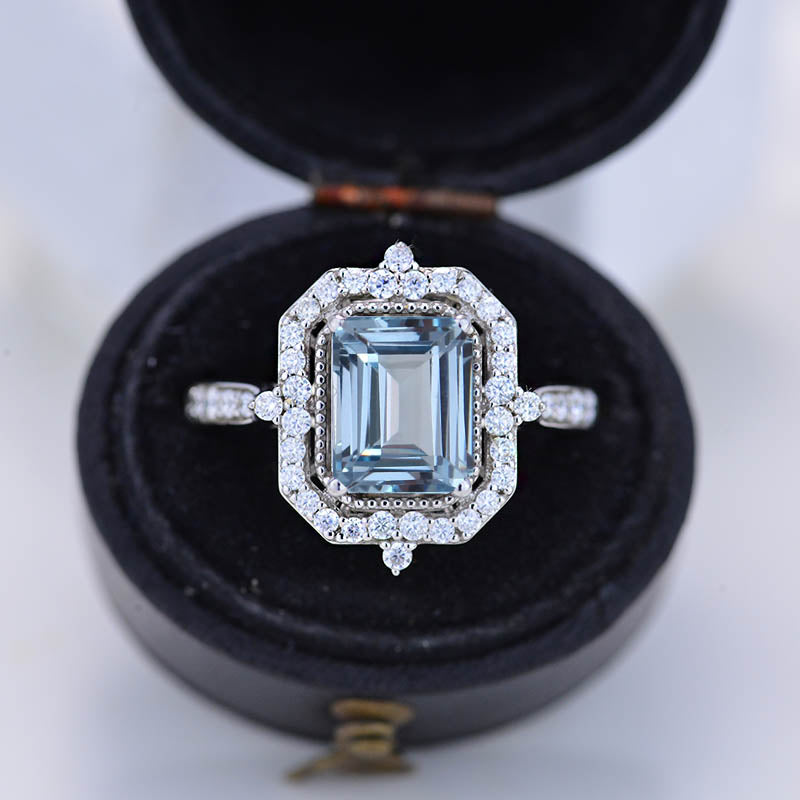 3Ct Emerald cut Halo Aquamarine ring, Aquamarine solitaire ring, natural aquamarine ring, genuine aquamarine emerald cut vintage ring