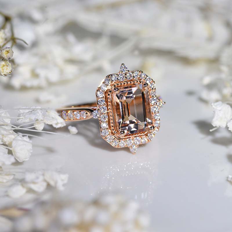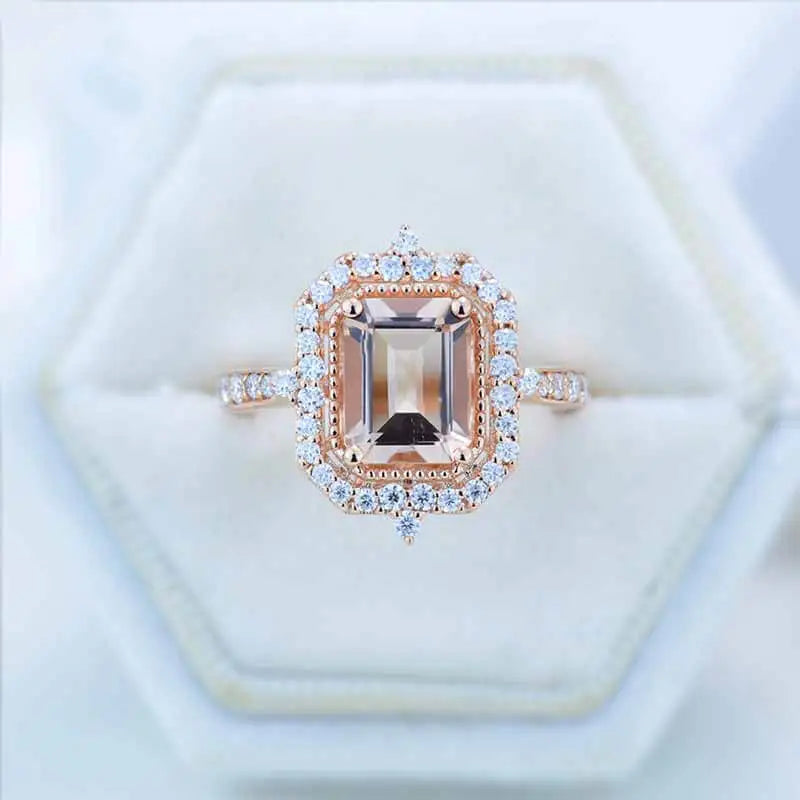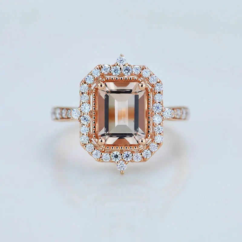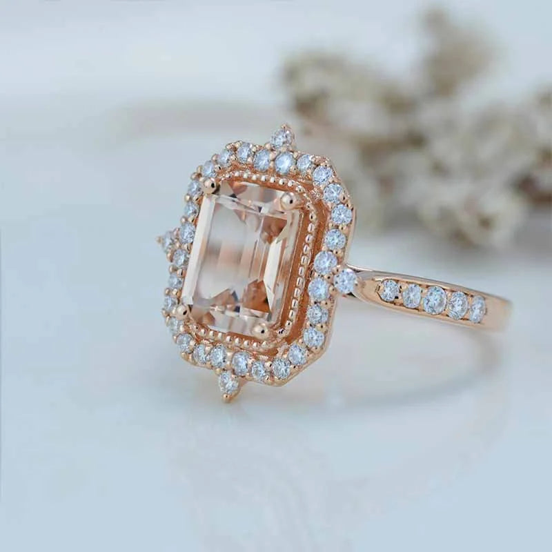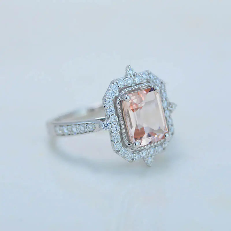 3Ct Emerald Cut Halo Morganite Ring, Morganite ring, Vintage Natural M - Giliarto