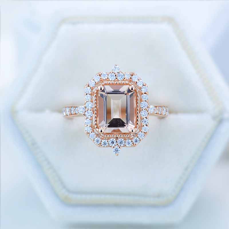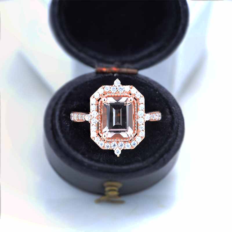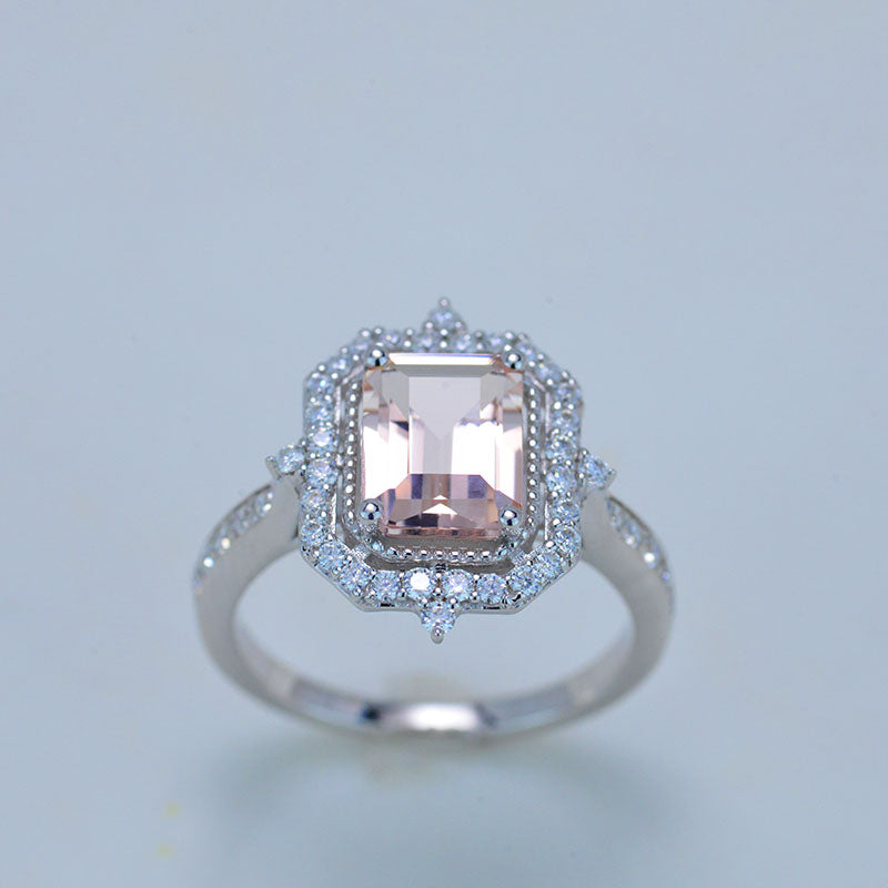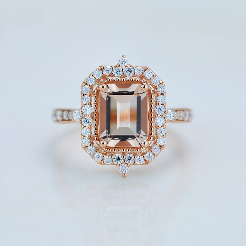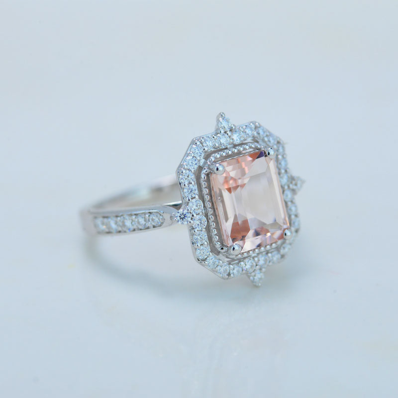 The default design option features 9x7mm Lab -Grown Peach Sapphire, VVS1-Clarity, VG-Cut, Ex-Polish, VG-Symmetry set with D-Colorless Moissanite Accents