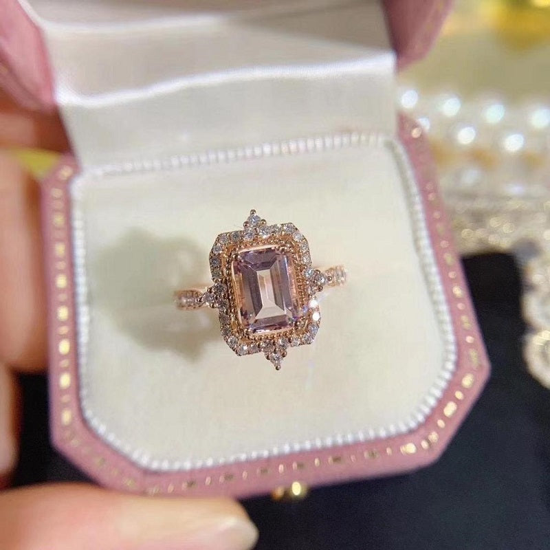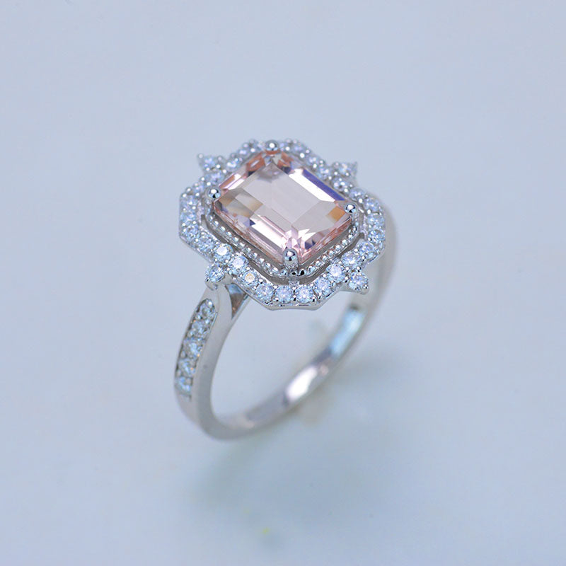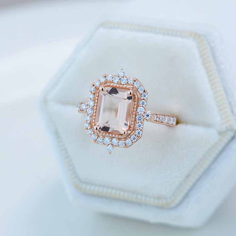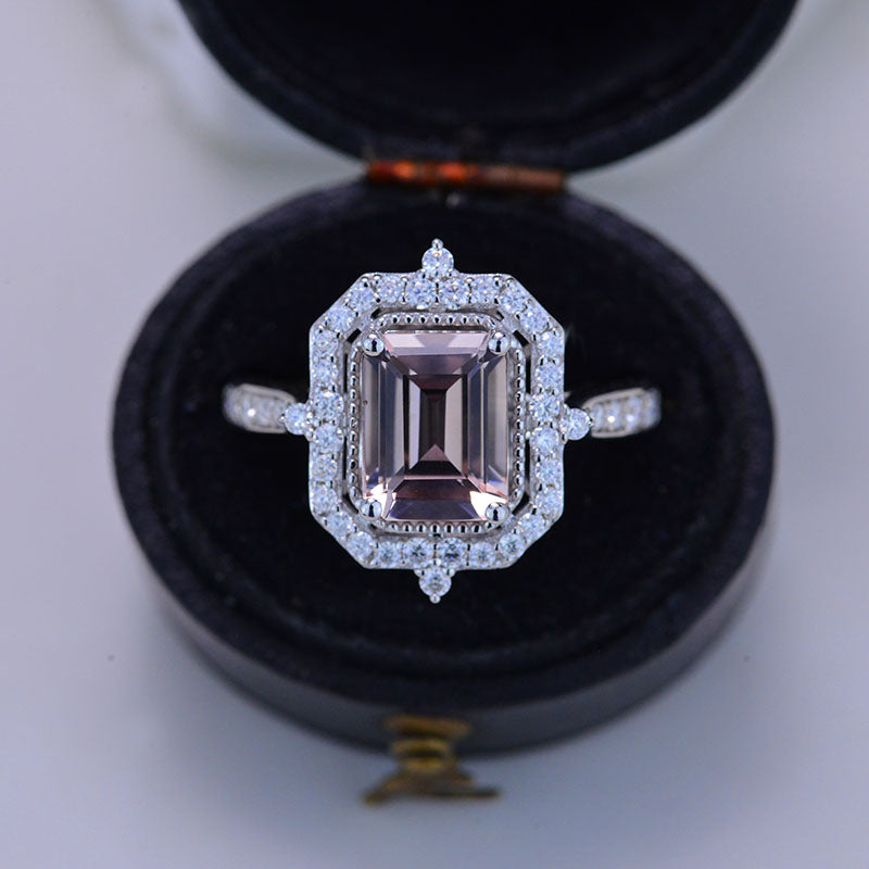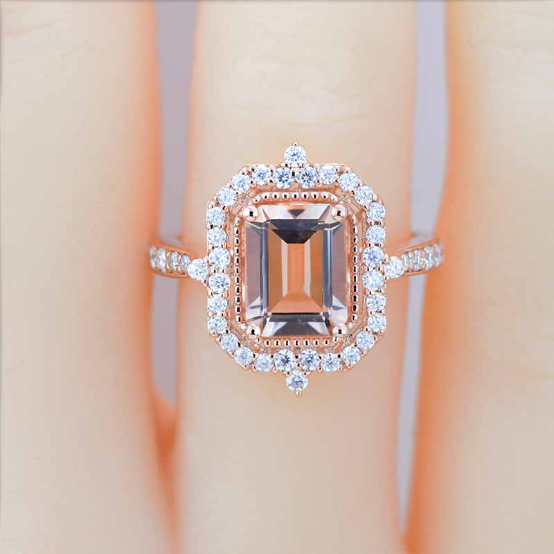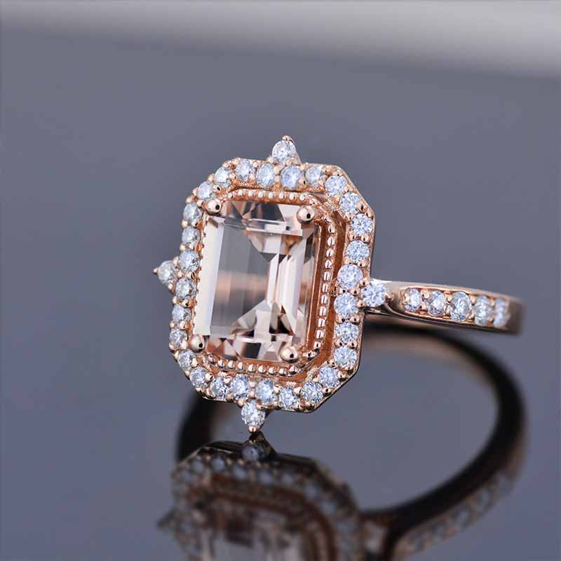 The default design option features 9x7mm Lab -Grown Peach Sapphire, VVS1-Clarity, VG-Cut, Ex-Polish, VG-Symmetry set with D-Colorless Moissanite Accents