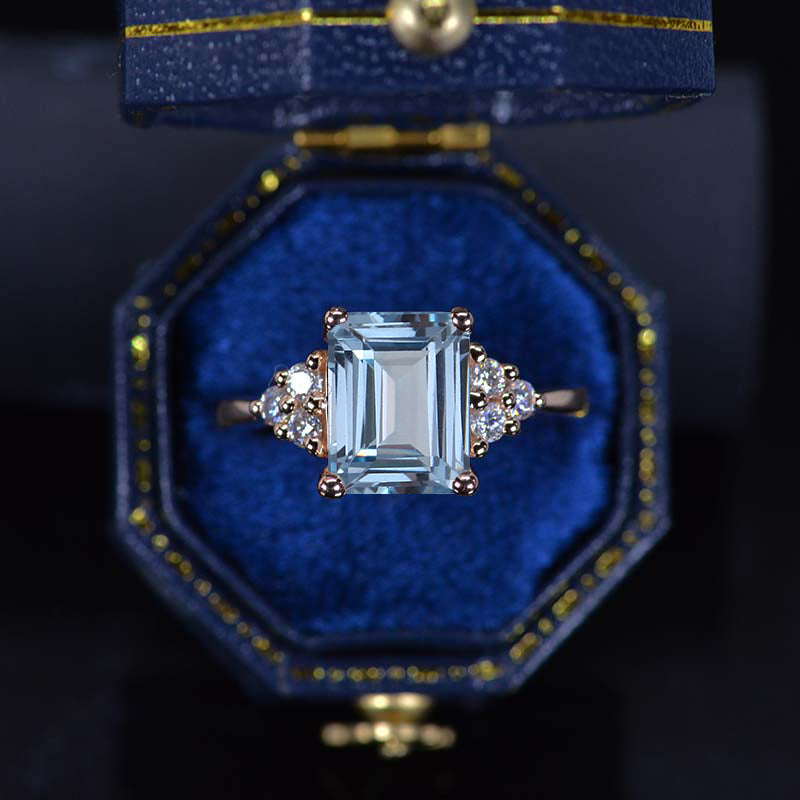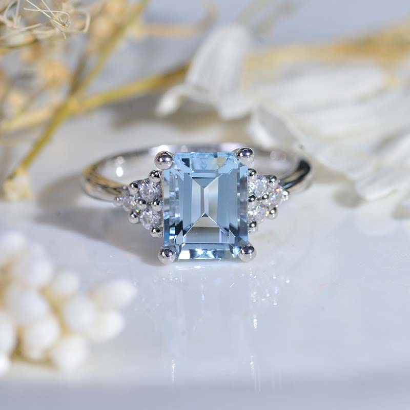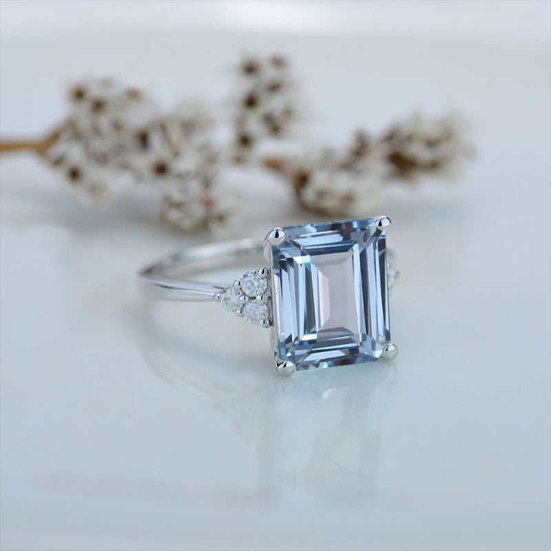 The default design option features 9x7mm Emerald Shaped Step Cut Genuine Natural Aquamarine, Set with Moissanite Accents stones, D-Colorless, VVS1-Clarity,