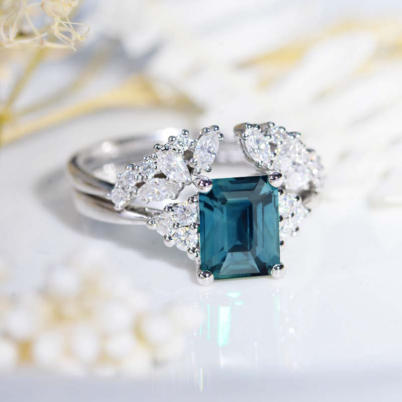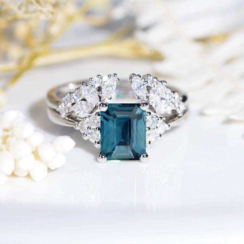 3Ct Emerald Shape Step Cut Teal Sapphire Ring, Solitaire ring, 3 Carat Teal Sapphire Ring, Teal Sapphire Vintage Ring Set