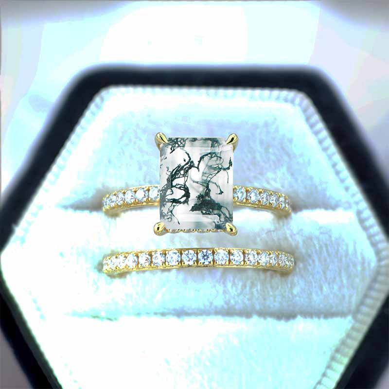3Ct Genuine Moss Agate Engagement Ring, Emerald Step Cut Genuine Moss Agate Engagement Ring Set Model 453-9x7
