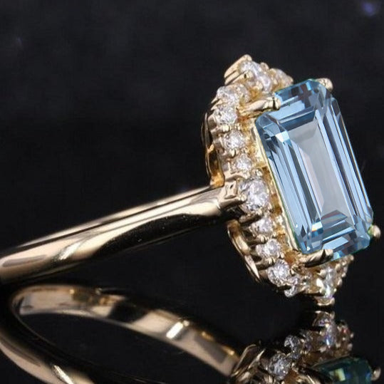 3Ct Genuine Natural Aquamarine Engagement Ring, Emerald Cut Halo Genuine Natural Aquamarine Engagement Ring