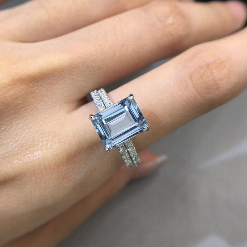 3Ct Genuine Natural Aquamarine Engagement Ring, Solitaire Emerald Cut - Giliarto