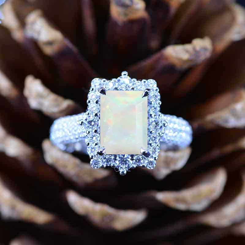 3Ct Genuine White Opal Engagement Ring Halo Emerald Step Cut Genuine White Opal Engagement Ring