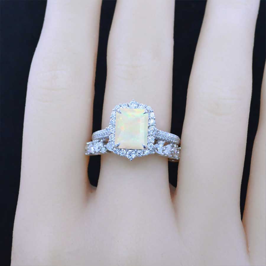 3 Carat Radiant Cut Center Stone Engagement ring. (Engagement Ring Only!) Setting: 14K White Gold (Available in Yellow Gold and Rose Gold) Center Stone: 3 Carat - 9x7 mm Radiant Cut Genuine White Opal Color: D-Colorless Clarity: VVS1 Side Stones: Moissanite Color: D-Colorless Clarity: VVS1 Cut: Excellent The total approximate weight of side stones: 0.9ct - 198 pieces.