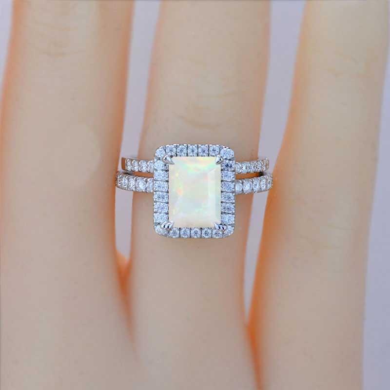 3Ct Genuine White Opal Engagement Ring Halo Radiant Cut Genuine White Opal Engagement Ring, 9x7mm Radiant Cut Genuine White Opal Engagement Ring with Eternity band