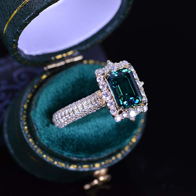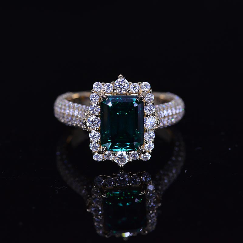 3 Carat Green Moissanite Emerald Shaped Step Cut Center Stone Engagement ring.