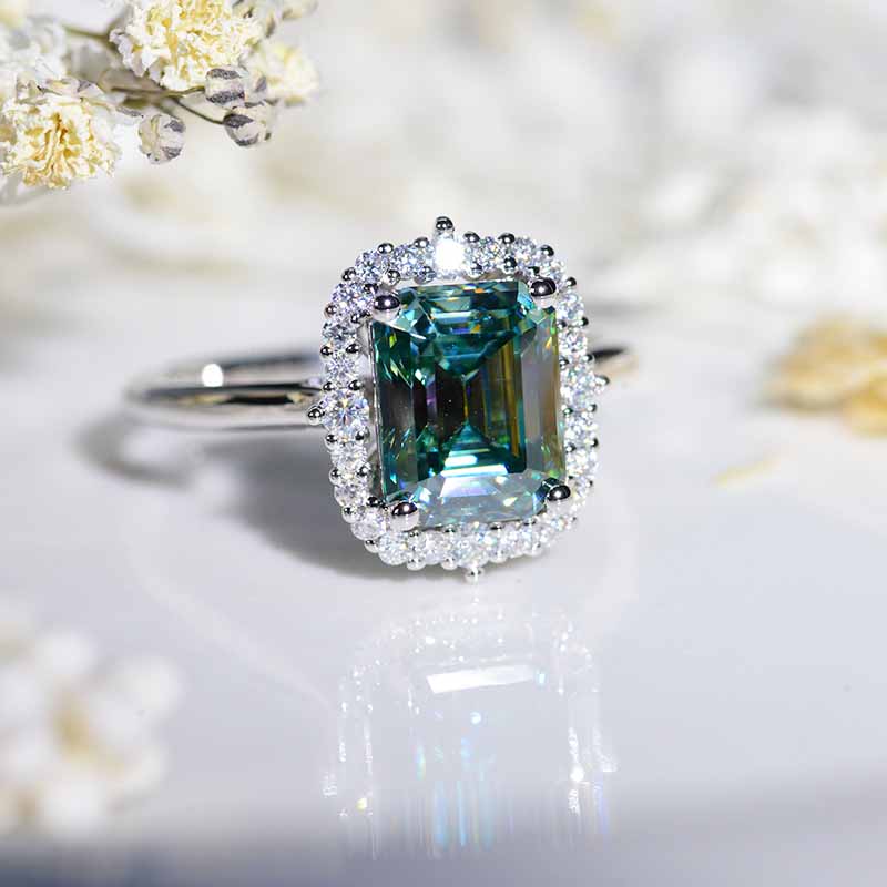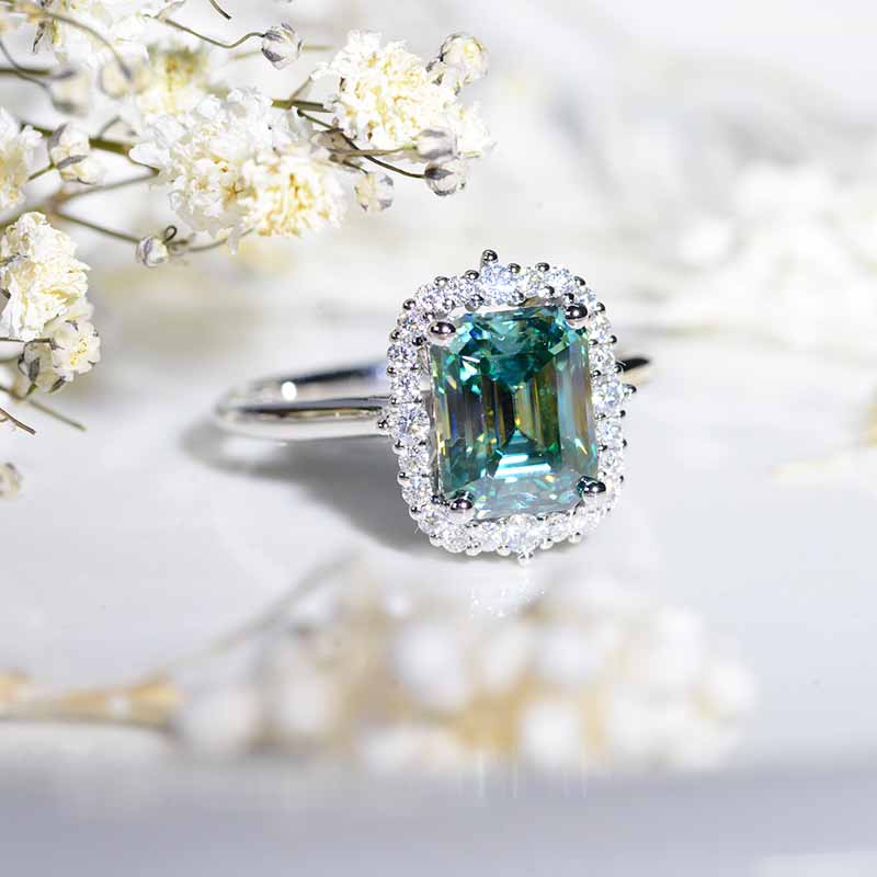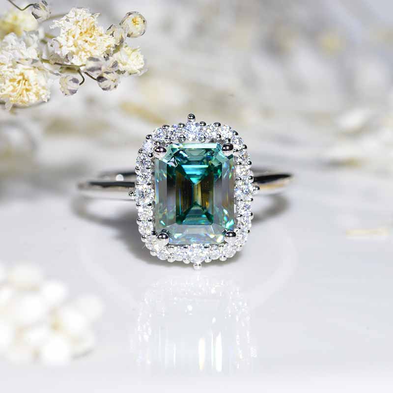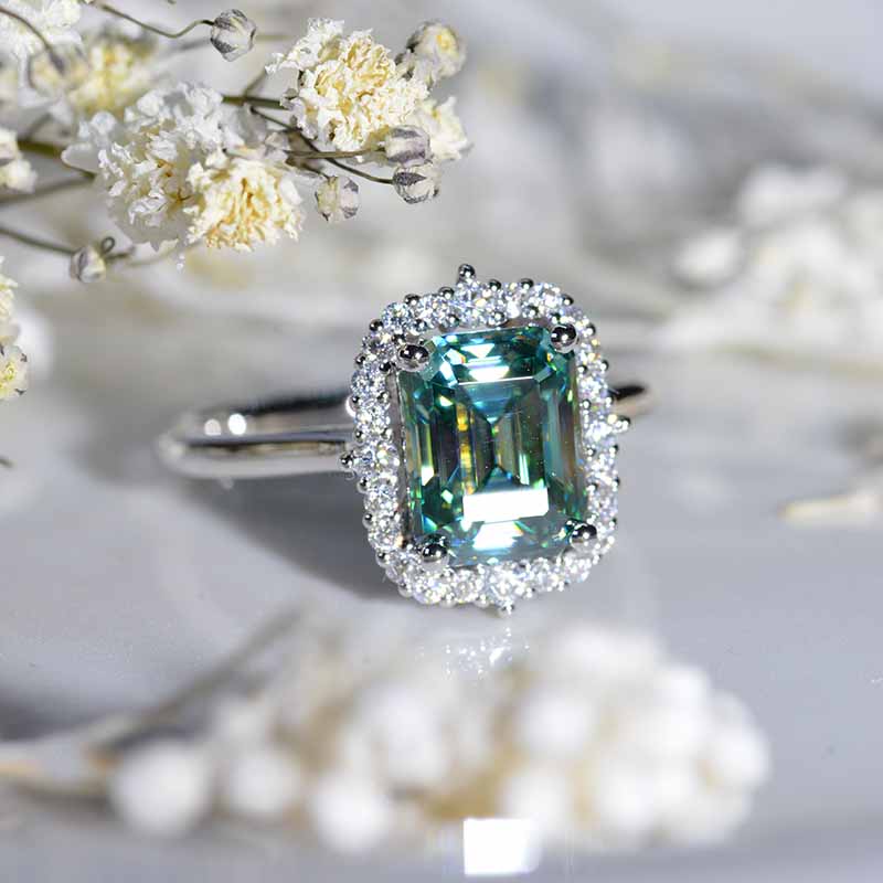 3Ct Green Moissanite Engagement Ring, Emerald Cut Halo Moissanite Enga - Giliarto