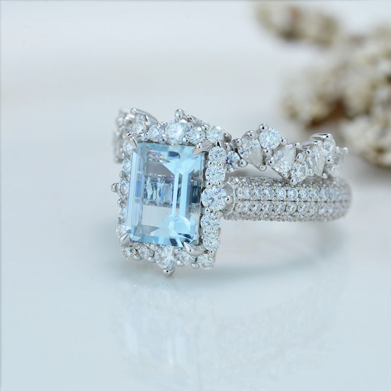 3 Carat Emerald Cut Natural Aquamarine Center Stone Engagement ring set.