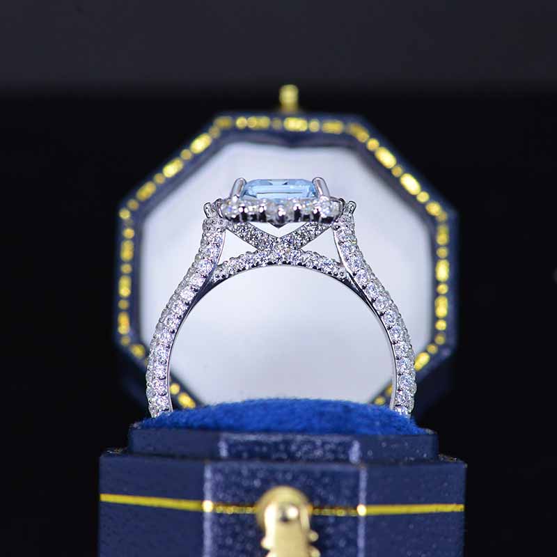 Side Stones: Moissanite Color: D-Colorless Clarity: VS2-Si1 Cut: Excellent The total approximate weight of side stones: 0.9ct - 198 pieces.