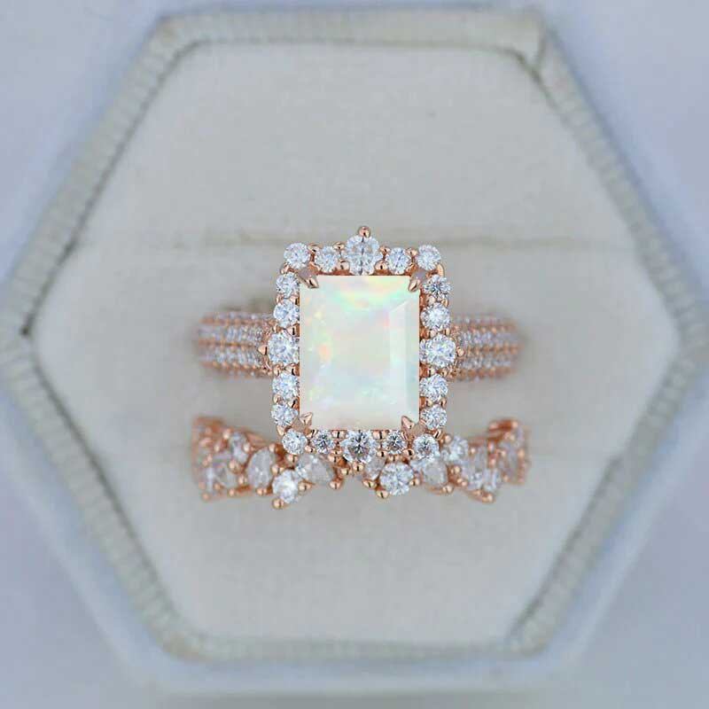 3Ct Natural Genuine White Opal Engagement Ring. Halo Emerald Cut Genuine White Opal 14K Rose Gold Engagement Ring