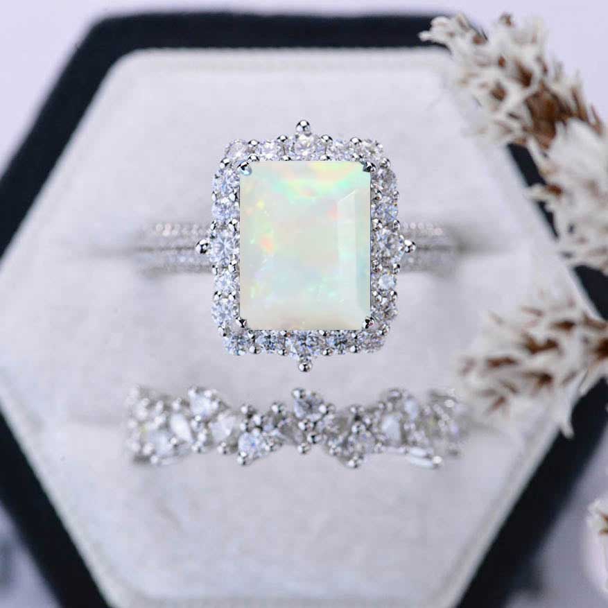3Ct Natural Genuine White Opal Engagement Ring. Halo Emerald Cut Genuine White Opal Engagement Ring, 9x7mm Step Cut Genuine White Opal Engagement Ring