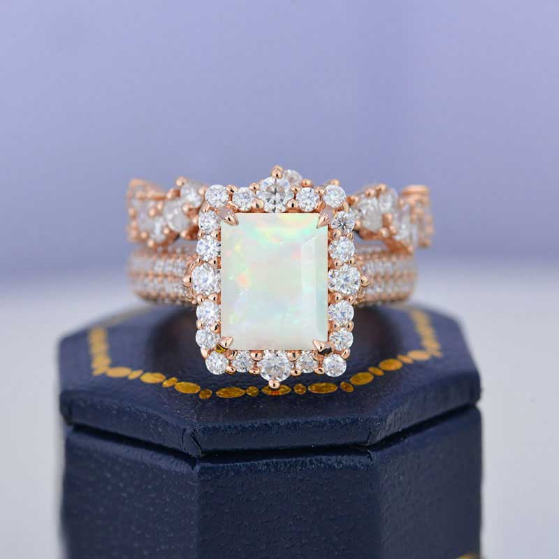 3 Carat Emerald Cut Natural Genuine White OpalCenter Stone Engagement ring set.
