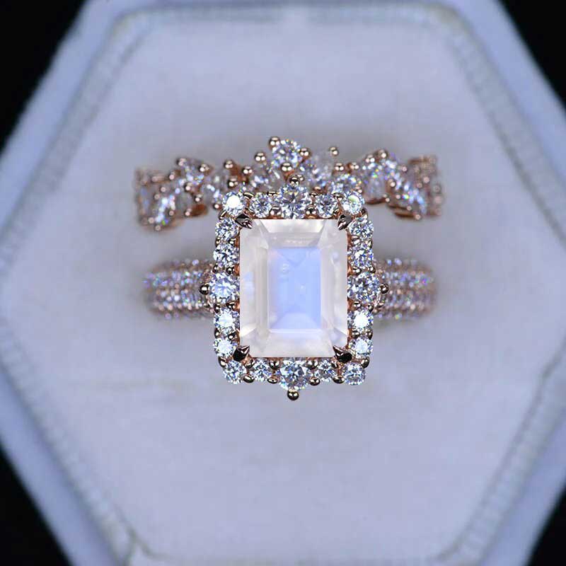 3 Carat Emerald Cut Natural Moonstone Center Stone Engagement ring set.