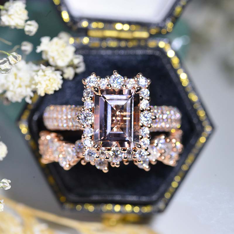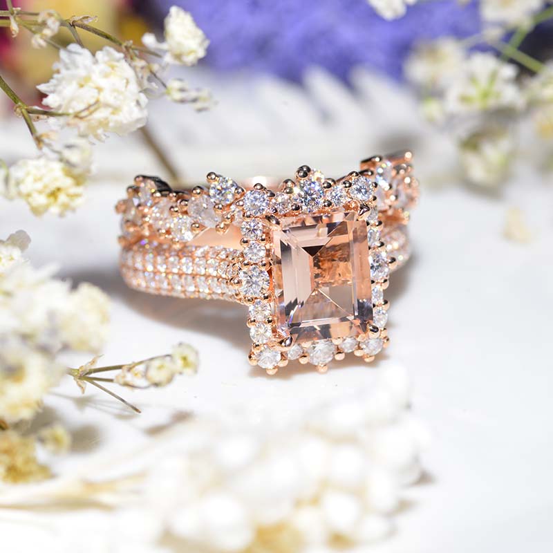 3 Carat Emerald Cut Natural Morganite Center Stone Engagement ring set.
