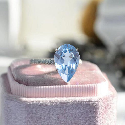The default design option features 11x7mm Pear Cut Genuine Aquamarine  AAA+ Quality Stone, VG-Cut, Ex-Polish, VG-Symmetry set with 0.8 CTW Moissanite Accents Stones