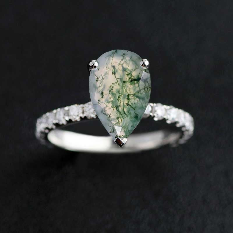 The default design option features 11x7mm Pear Cut Genuine Moss Agate Stone, VG-Cut, Ex-Polish, VG-Symmetry