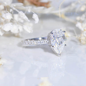 3Ct Pear Moissanite Hidden Halo Engagement Gold Ring, 11x7mm Pear Cut Moissanite Engagement Ring, Micro Pave Accents Stones Model 524-11x7