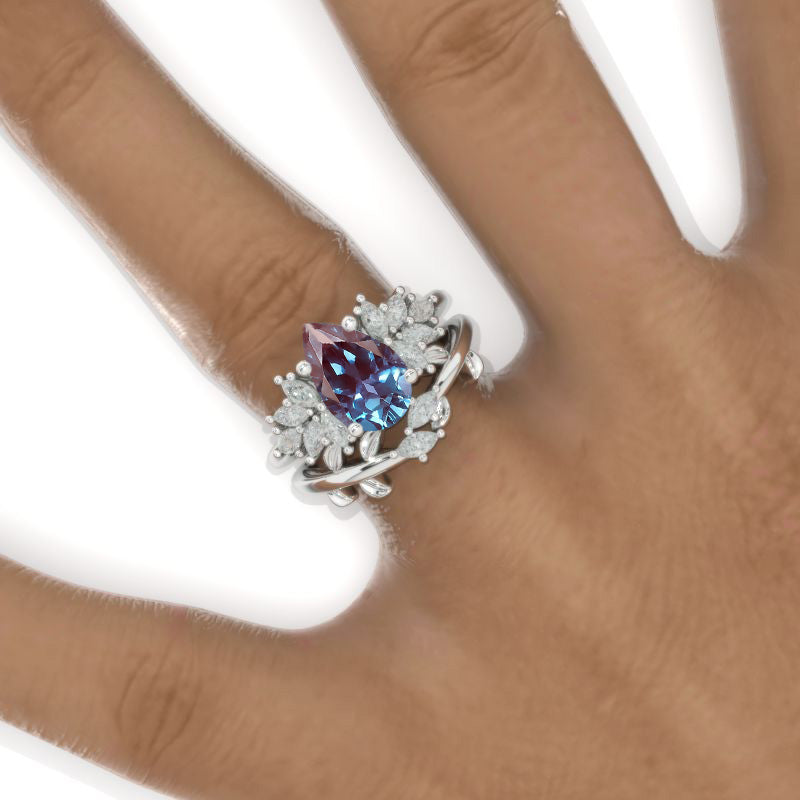3CT Pear Shape Alexandrite Engagement Ring Set, 3 Carat Pear Floral Tw - Giliarto