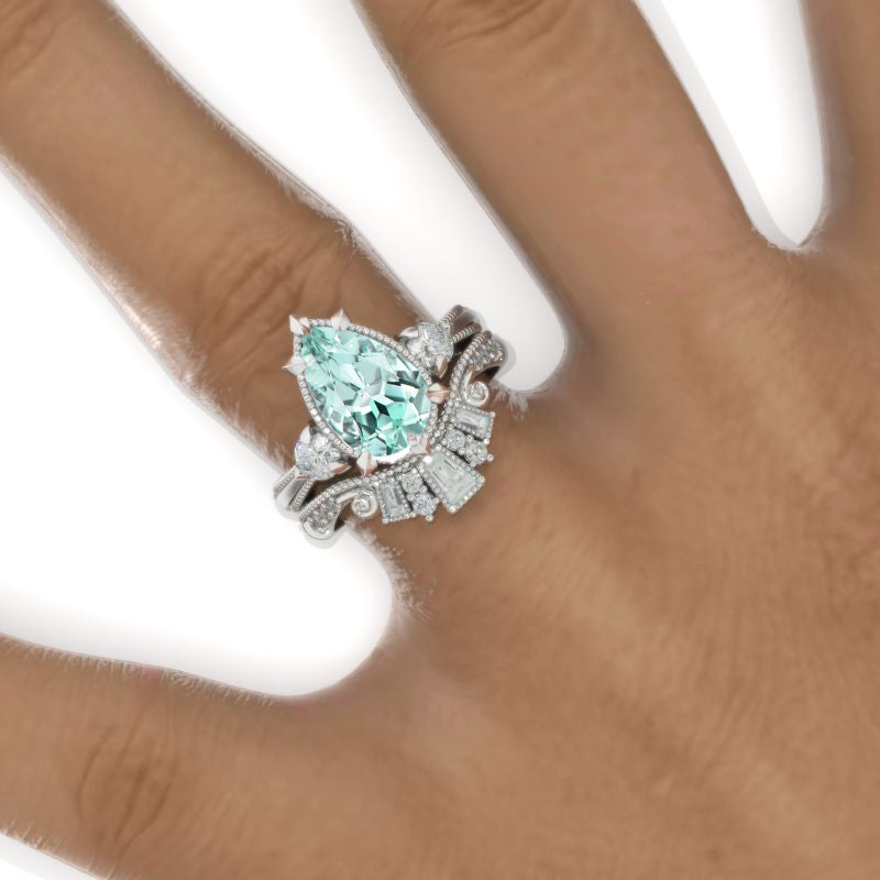 The default design option features 11x7mm Pear Center Ethically Lab-Grown Mint Sapphire, VG-Cut, Ex-Polish, VG-Symmetry, Set with Colorless Moissanite Accent stones in 14K White Gold Engagement Ring Set.
