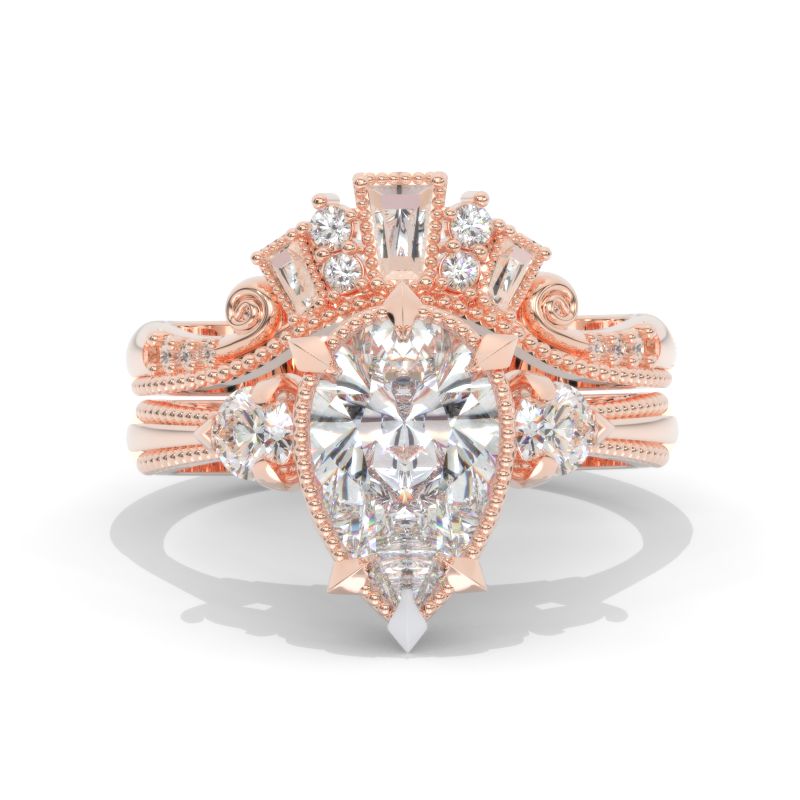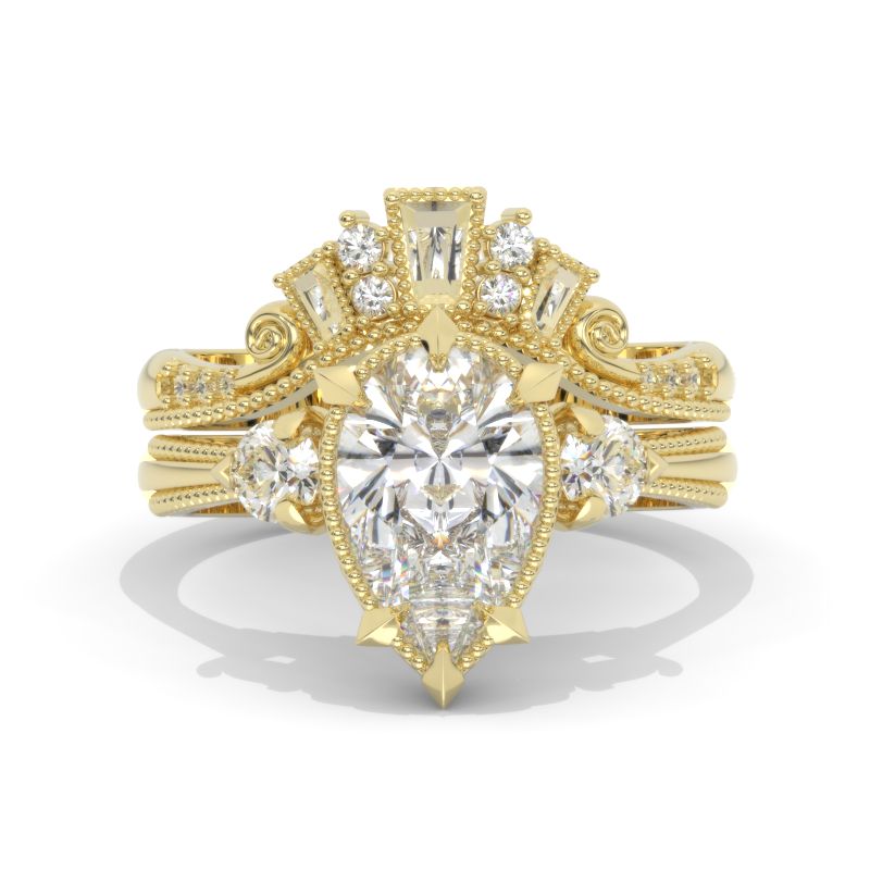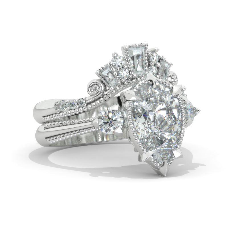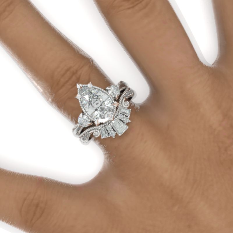 The default design option features 11x7mm Pear Center Moissanite D-Colorless VVS1-Clarity, VG-Cut, Ex-Polish, VG-Symmetry, Set with Colorless Moissanite Accent stones in 14K White Gold Engagement Ring Set.Â