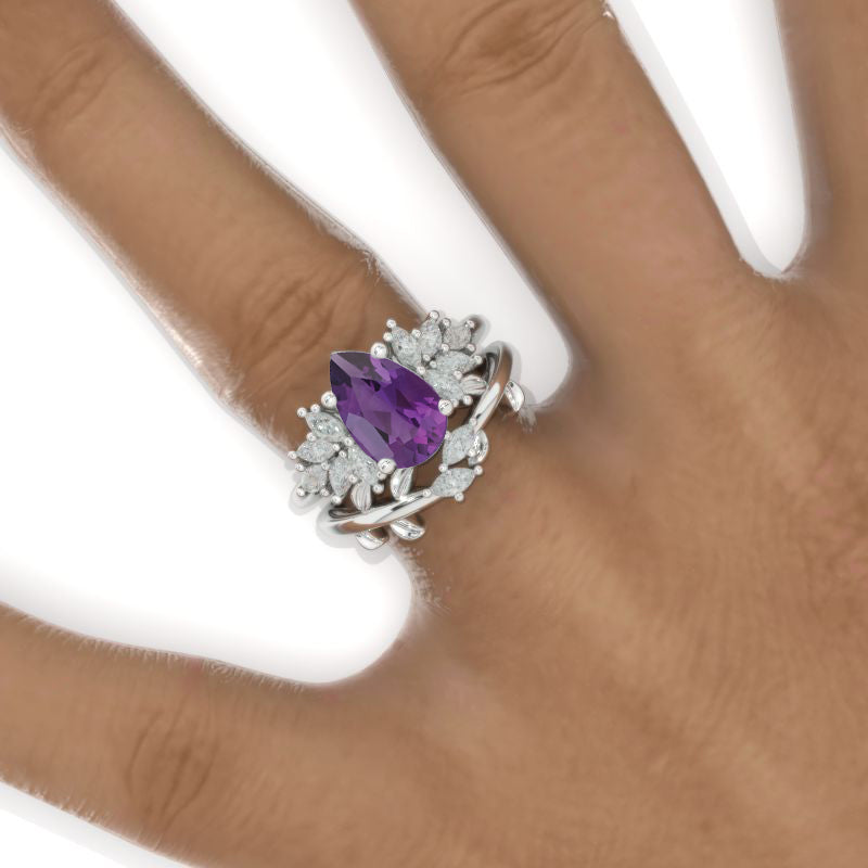 The default design option features 11x7mm Pear Center Genuine Natural Amethyst- AAAA GradeĀ VG-Cut, Ex-Polish, VG-Symmetry set with D- Colorless Moissanite Accent StonesĀ
