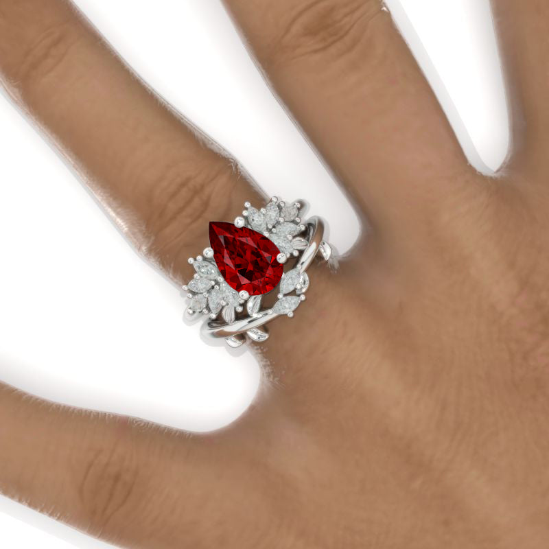 3CT Pear Shape Ruby Engagement Ring Set, 3 Carat Pear Floral Twig Desi - Giliarto