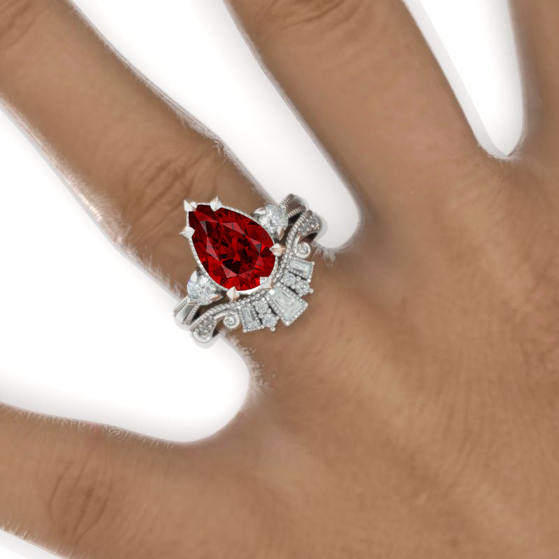 The default design option features 11x7mm Pear Center Ethically Lab-Grown Ruby AAA+ Grade VG-Cut, Ex-Polish, VG-Symmetry, Set with Colorless Moissanite Accent stones in 14K White Gold Engagement Ring Set.