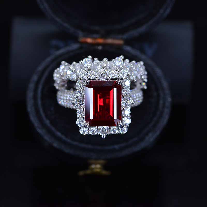 4 Carat Emerald Cut Ethically Lab-Grown Ruby Center Stone Engagement ring set of two rings.