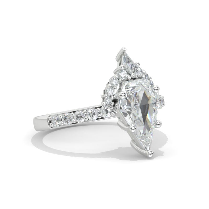 The default design option features 12x8mm Kite Center Moissanite Stones,Â