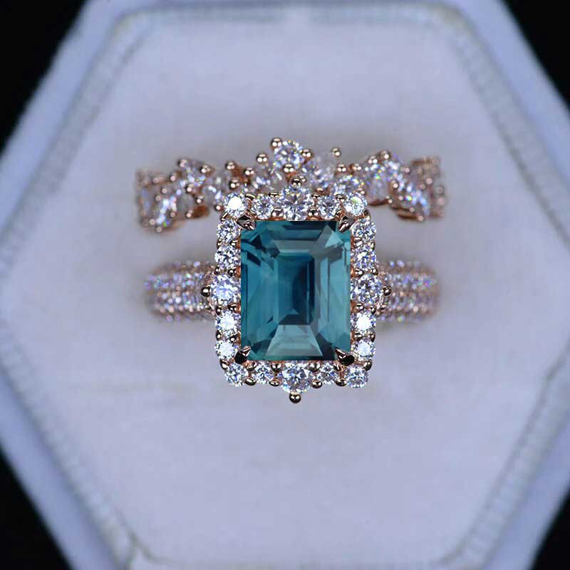 3 Carat Emerald Cut Ethically Lab-Grown Teal Sapphire Center Stone Engagement ring set.