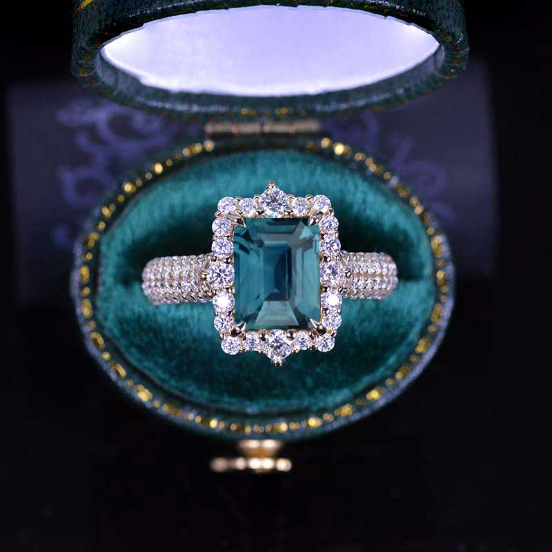 3 Carat Ethically Lab-Grown Teal Sapphire Emerald Shaped Step Cut Center Stone Engagement ring.