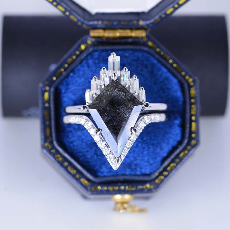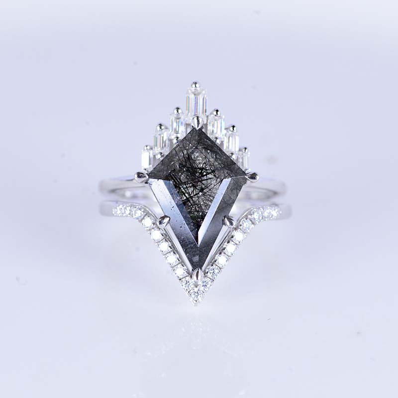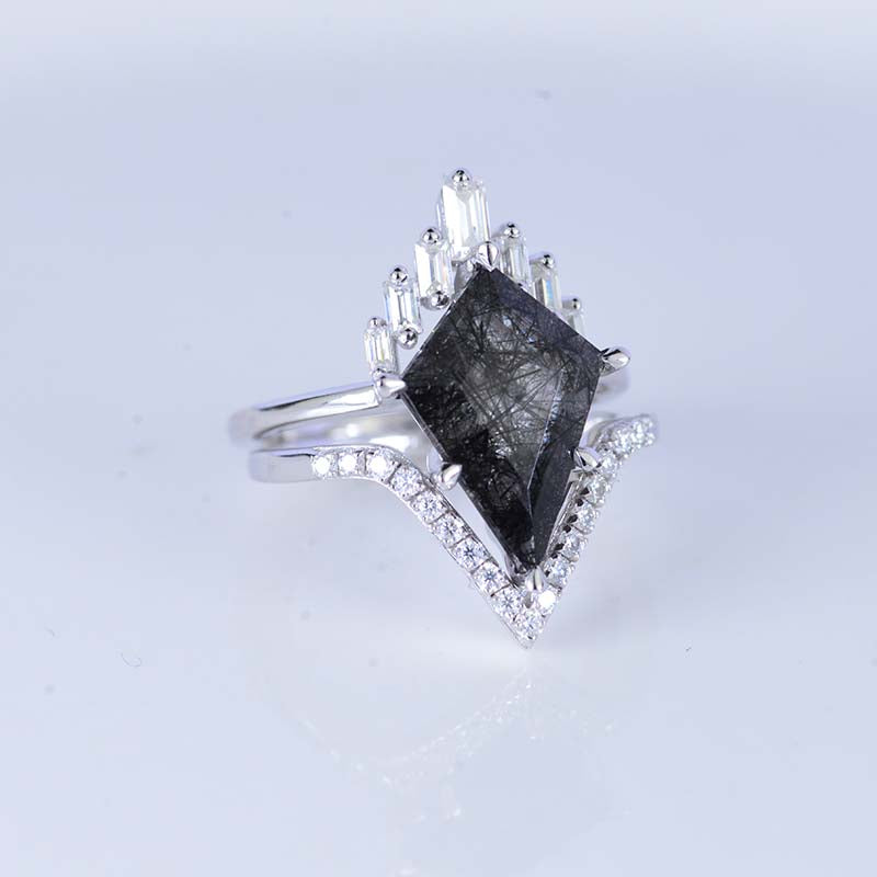 Engagement : 4 Carat Black Rutile Quartz Kite 14x10 mm, VVS1-Clarity, VG-Cut, Ex-Polish, VG-Symmetry Center Stone with 38 Colorless 0.5 CTW Moissanite,