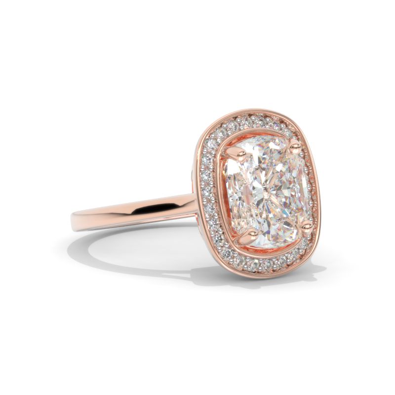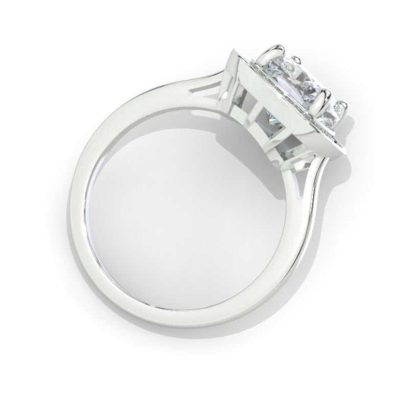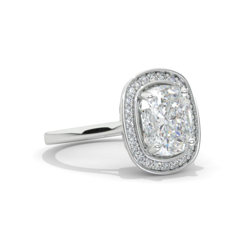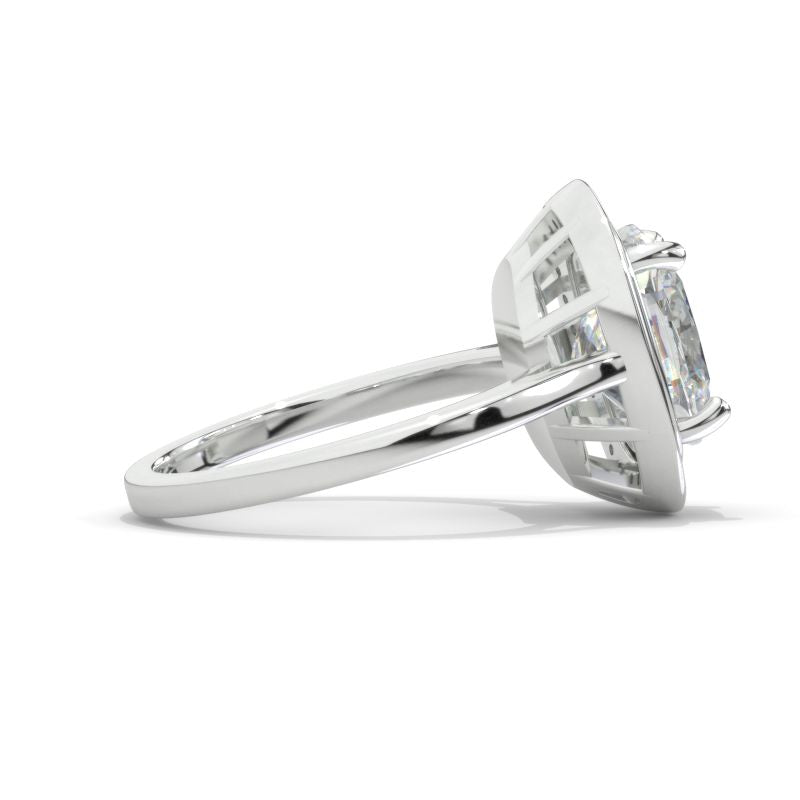 The default design option features approximately 4+ Carat 10x8mm Cushion Cut LAB-Grown Diamond Center And Accent Stones D-Colorless, VVS1-Clarity, VG-Cut, Ex-Polish, VG-Symmetry