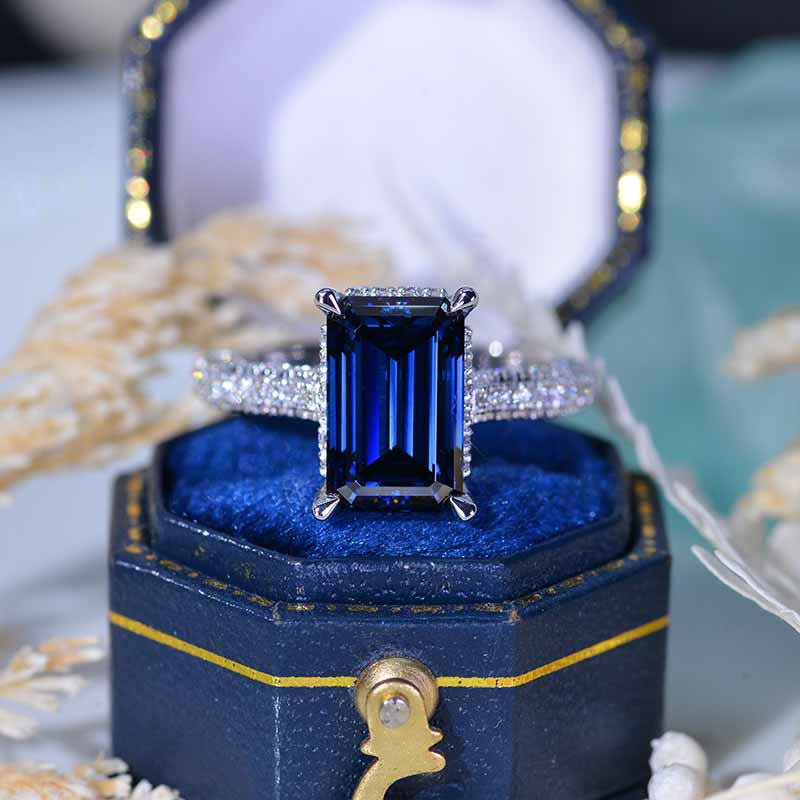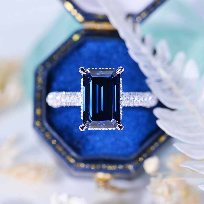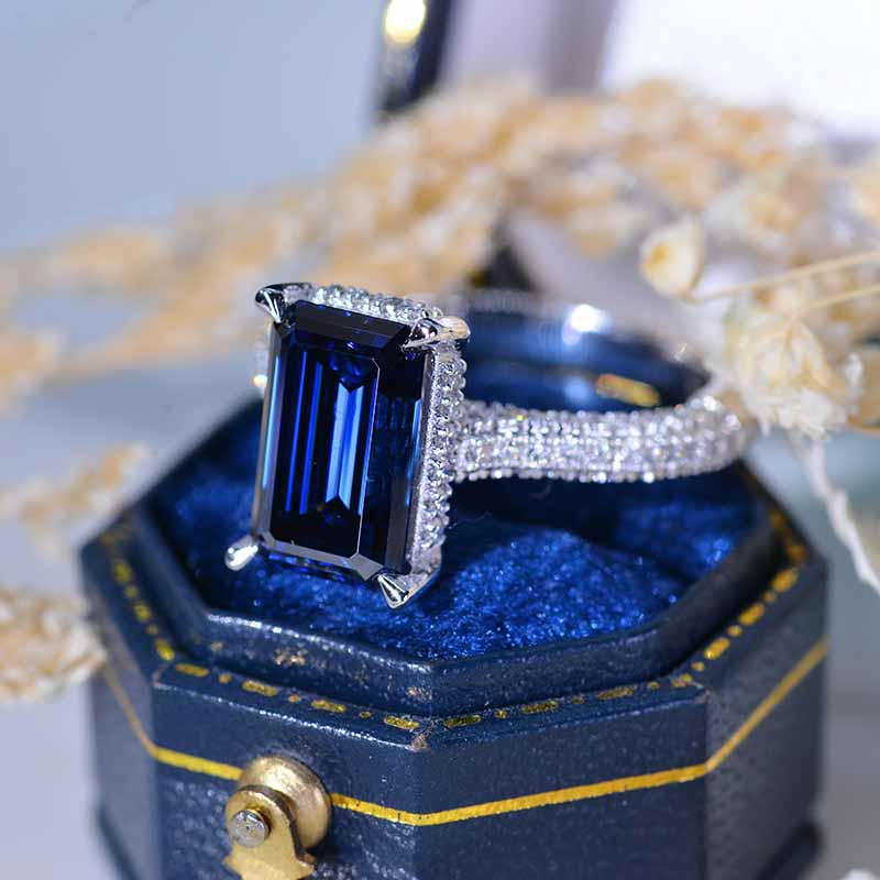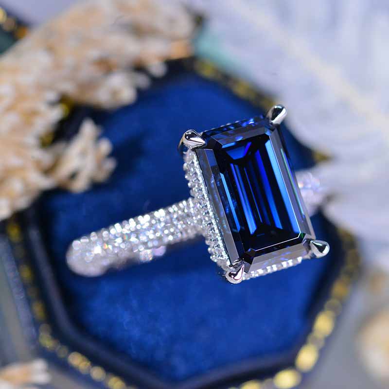 Setting:14K Black Gold Center Stone:11x7mm Emerald Cut Dark Gray-Blue Moissanite 4 Carat. Color: Dark Gray-Blue, Clarity: VVS1, Side Stones: Diamond D-Colorless Clarity: VVS1, Cut: Excellent The total approximate weight of side stones: 130- 1.5 CTW Shank width: 2 mm Matching Band: