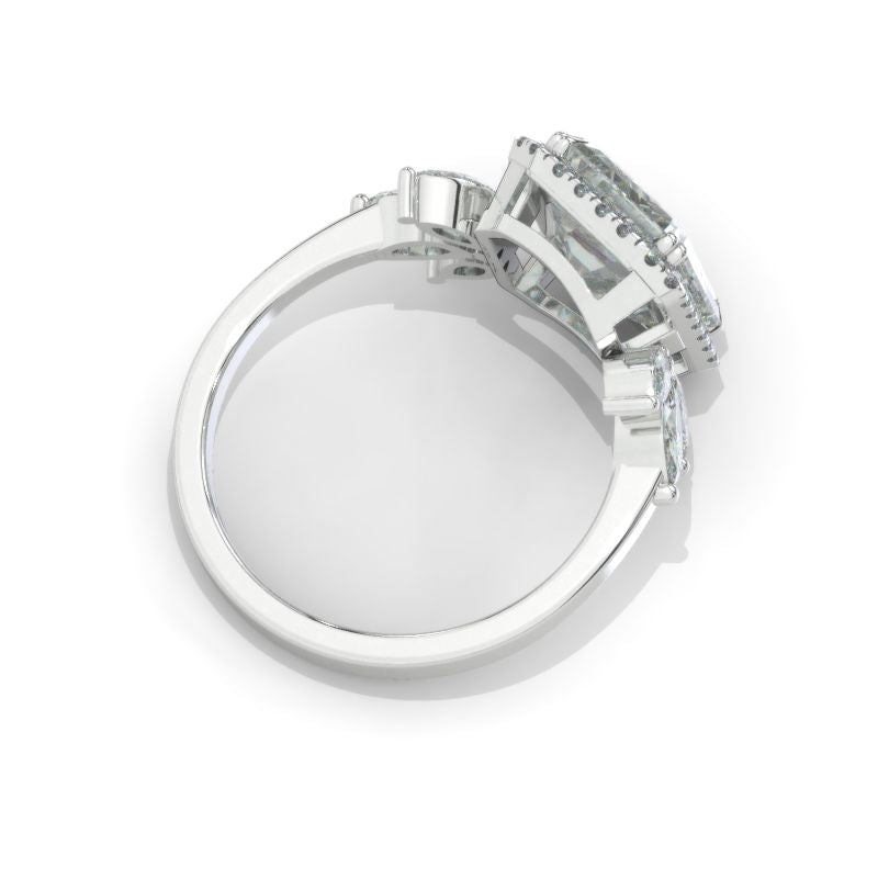 The default design option features 10x8mm Emerald Cut Moissanite Center Stone D-Colorless VVS1-Clarity, VG-Cut, Ex-Polish, VG-Symmetry with 0.4 CTW Moissanite Accent StonesÂ