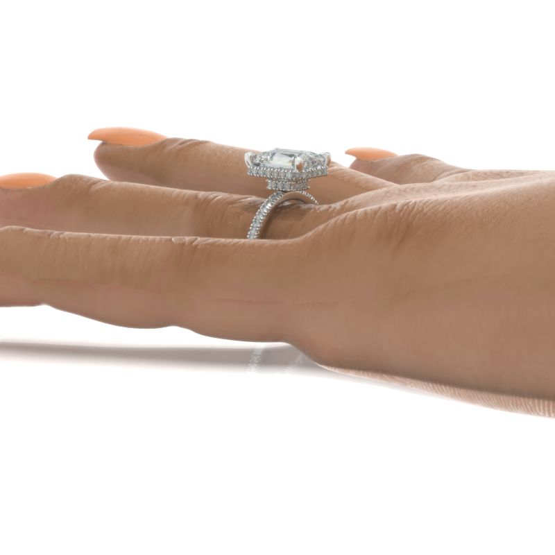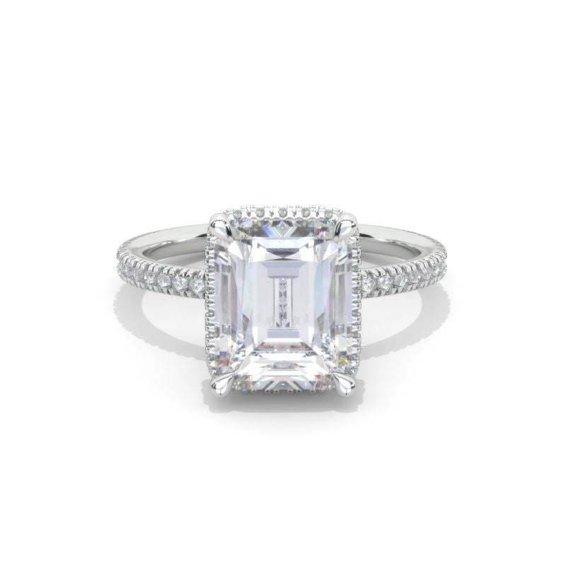 The default design option features approximately 4+ Carat LAB-Grown Diamond- Emerald Cut 10x8mm D-Colorless, VVS1-Clarity, VG-Cut, Ex-Polish, VG-Symmetry Center Stone with